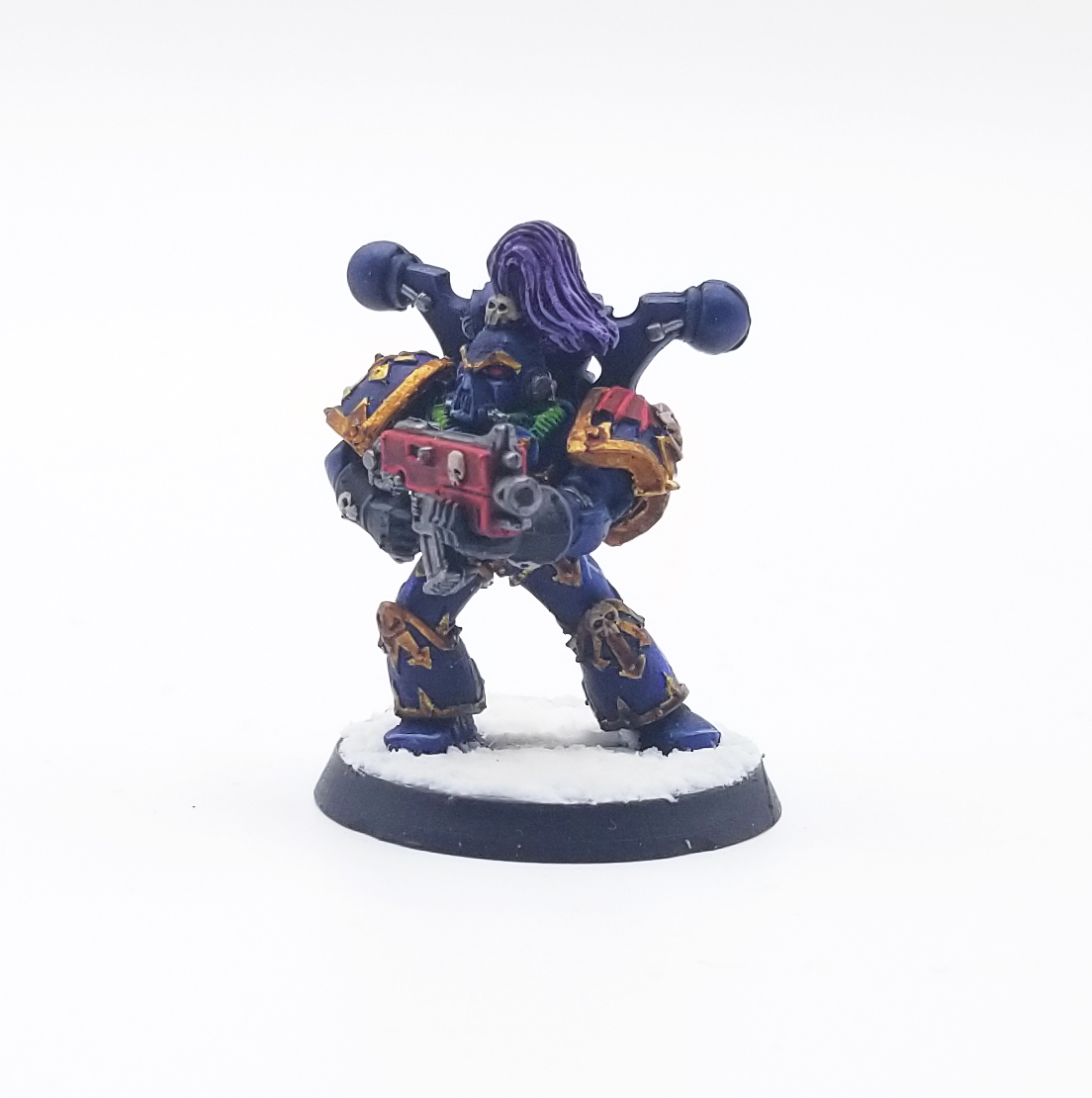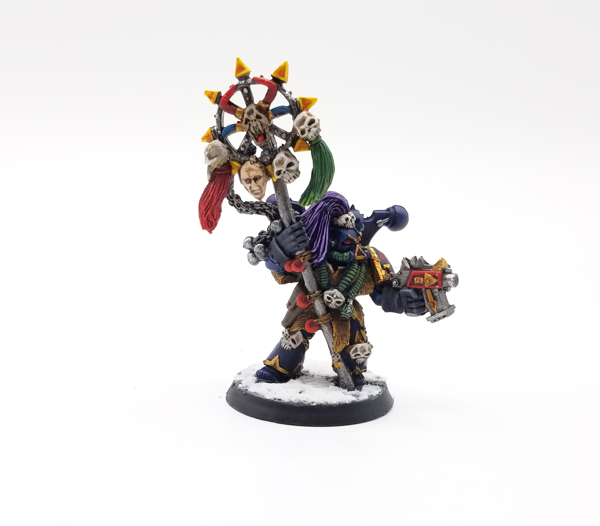 Although this is not a 2nd edition Thousand Sons model (it's a third edition model using the metal upgrade kit), I've painted it in 2nd edition colors, using a deep blue scheme and gold trim.