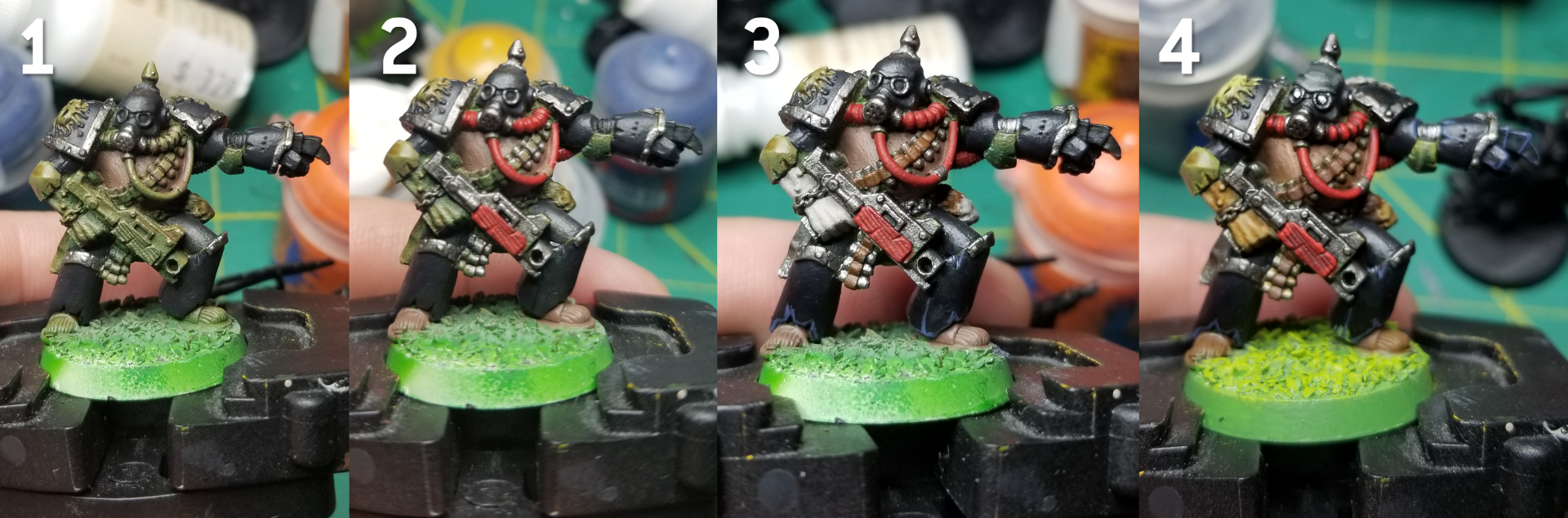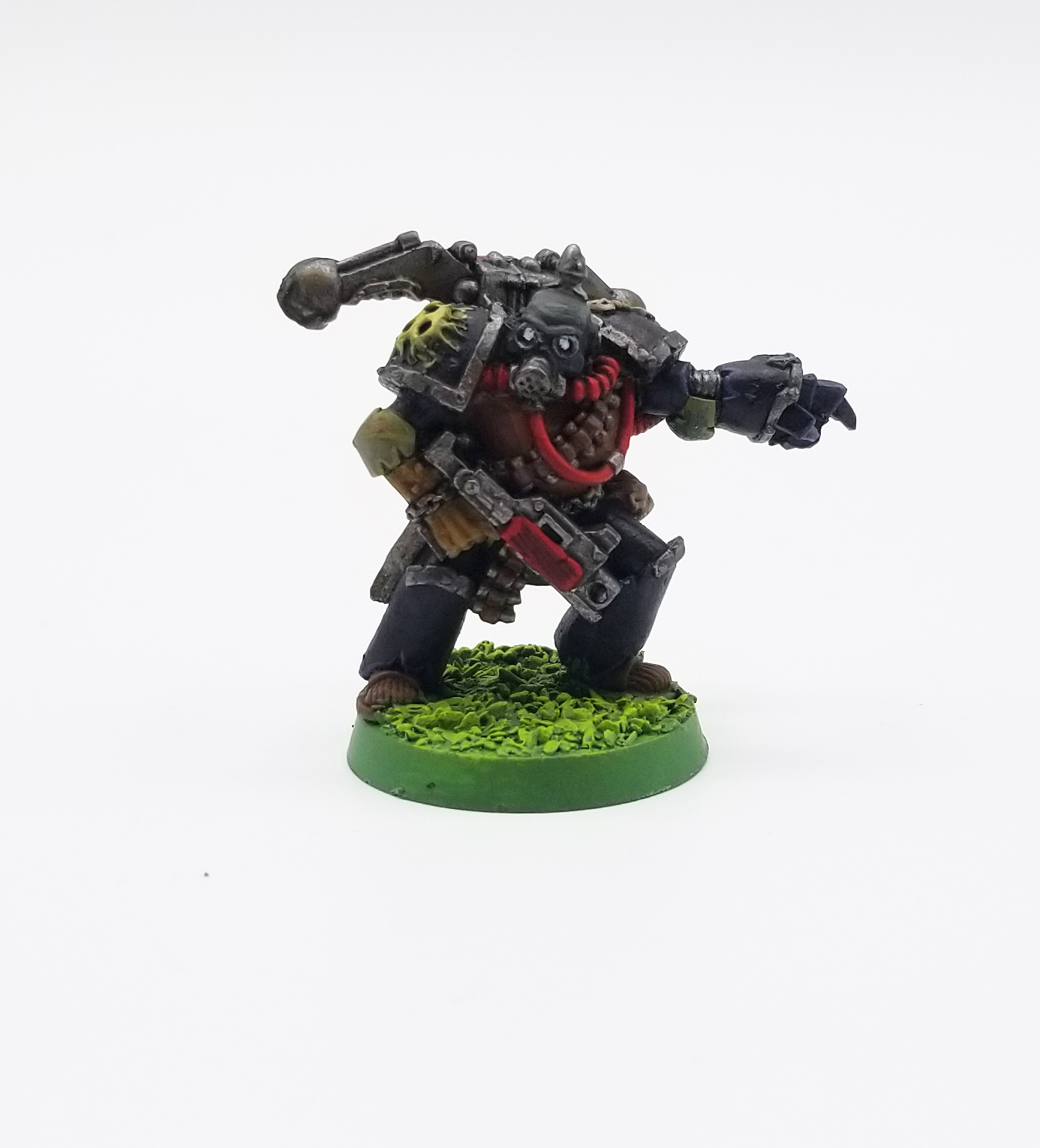 The cabling on 2nd ed Death Guard is bright red, and I do that here by painting the cables Mephiston Red, then washing that with Carroburg Crimson and highlighting with Mephiston and Evil Sunz Scarlet. The exposed arm is just Rakarth Flesh with a few washes of Seraphim Sepia. I highlighted the mask with mixes of Corvus Black, Death Guard Green, and Mechanicus Standard Grey. The eyes are dots of Reaper Ghost White. Finally, the base followed SRM's Goblin Green bases tutorial.