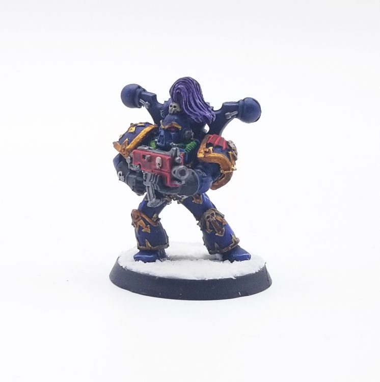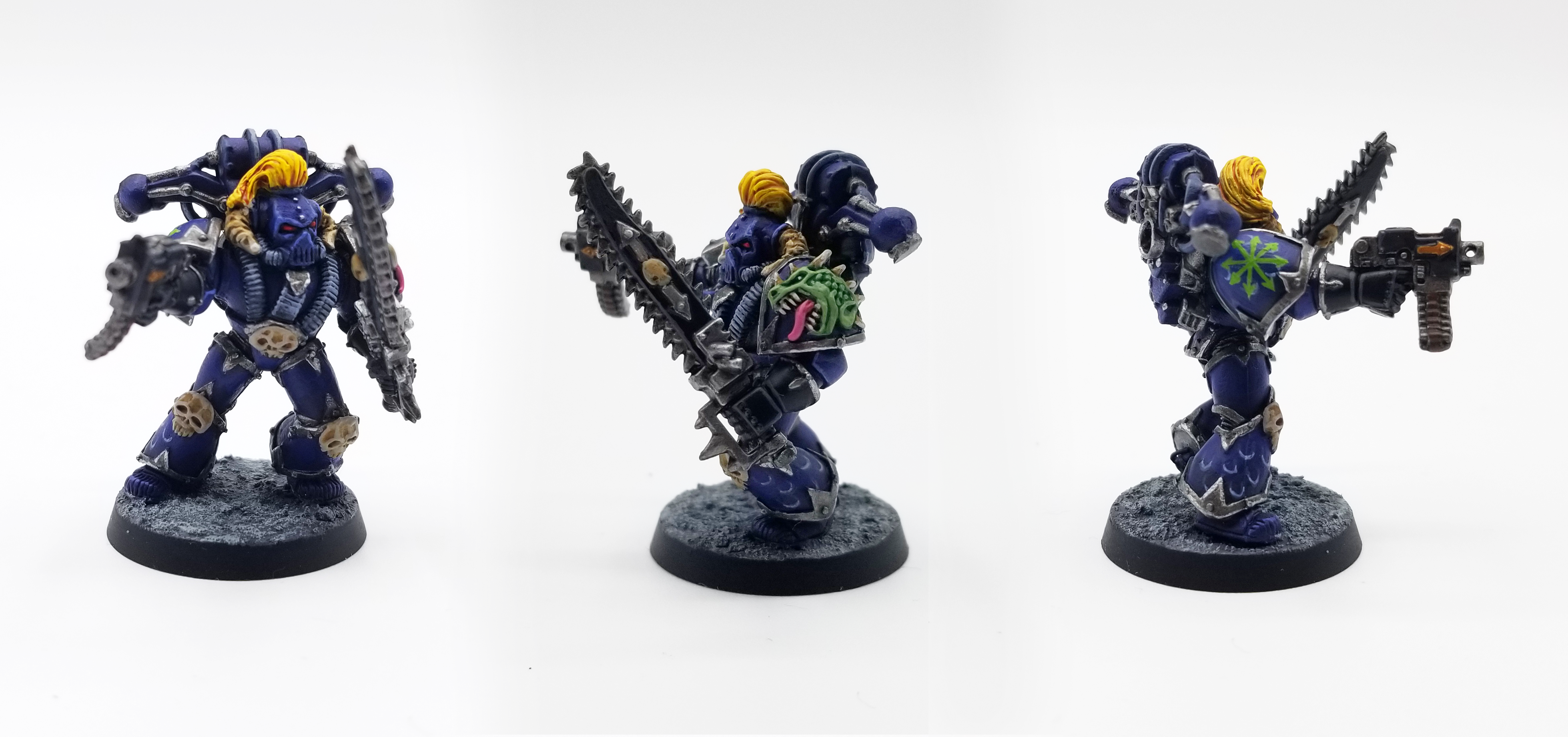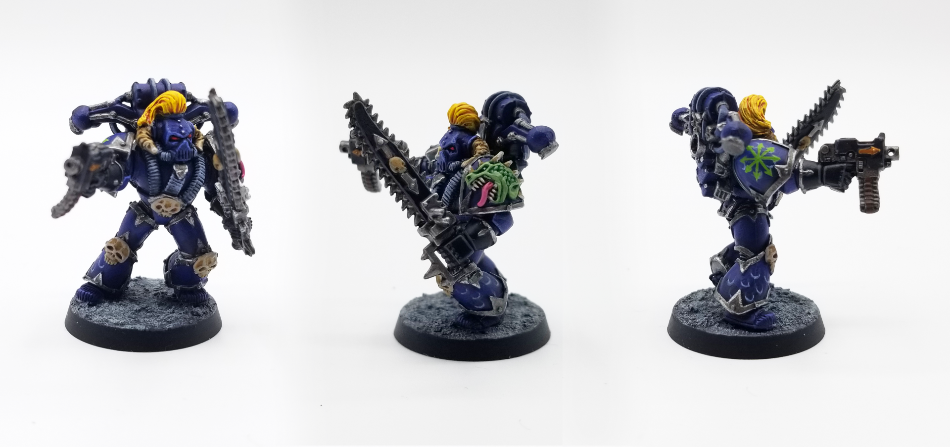First introduced proper in the 2nd edition Codex: Chaos, the Alpha Legion have become a bit of a fan favorite since, thanks to some cool backstory elements and fluff establishing them as the sneakiest chaos marines, and some very good rules in the 8th edition Codex: Chaos Space Marines. Although newer schemes for them give them blue - green armor with a fade and green highlights, and the Horus Heresy variant uses metallic blue-green shades, the original paint scheme for the Alpha Legion was a much deeper blue - almost indigo. I've tried to replicate that here.