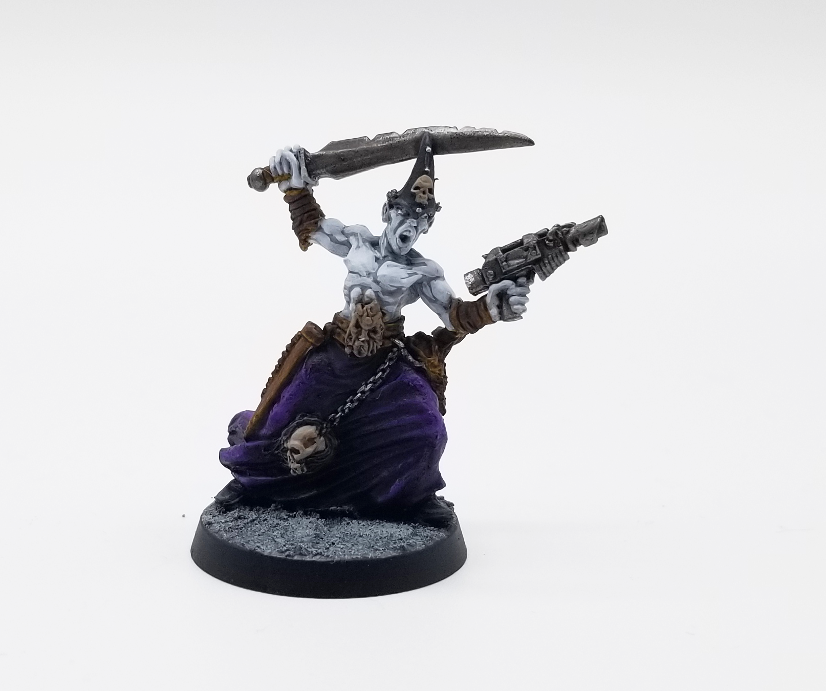 Released in late 1998 shortly before 3rd edition launched, the metal Chaos Cultists are a bit of a rarity among GW metal models. In their older paint schemes their flesh had a darker, grey and slightly purple tone. I've tried to replicate this by basecoating with Grey Seer and then painting the skin with Apothecary White and then highlight with Reaper Ghost White. The robes are painted with Naggaroth Night and highlighted with a mix of Xereus Purple and Reaper Pure White.