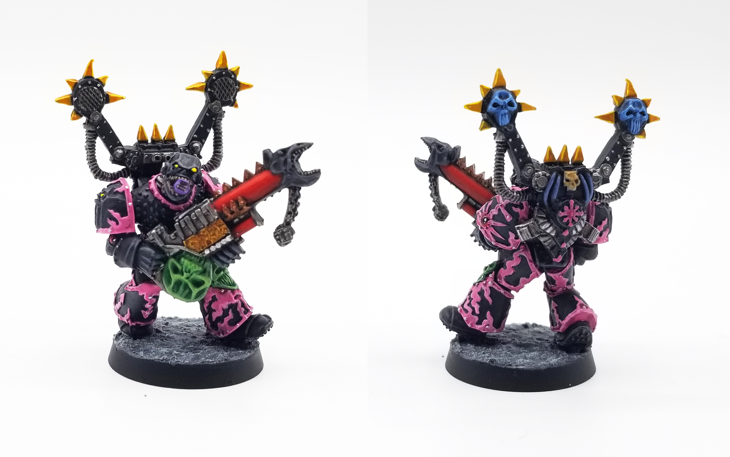 2nd Edition Noise Marines were a lot less uniform in color, using mostly dark armor with lots of bright pink, blue, and yellow trim to go with the metal models that came out about 6 months after Codex: Chaos released. They're pretty wild models on the whole, and unlike nearly anything else in the Chaos range.