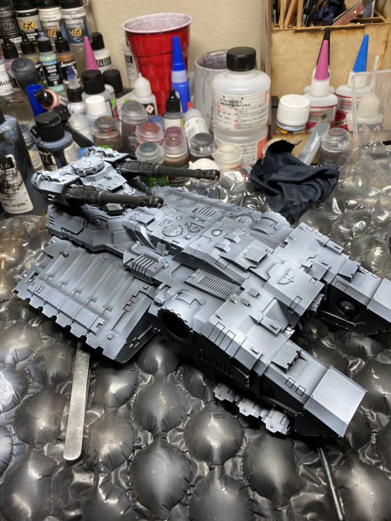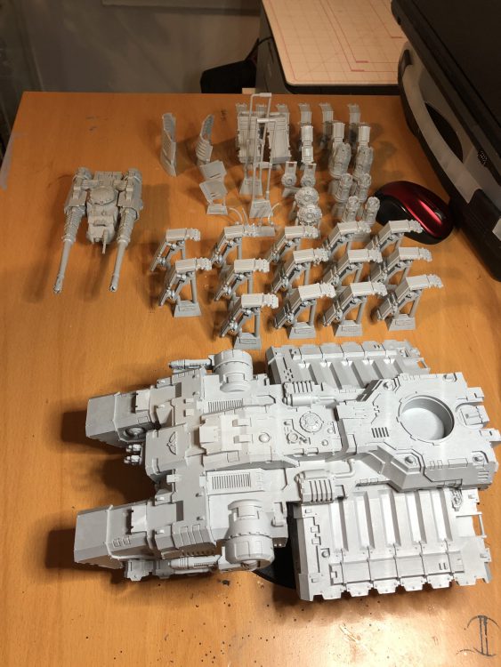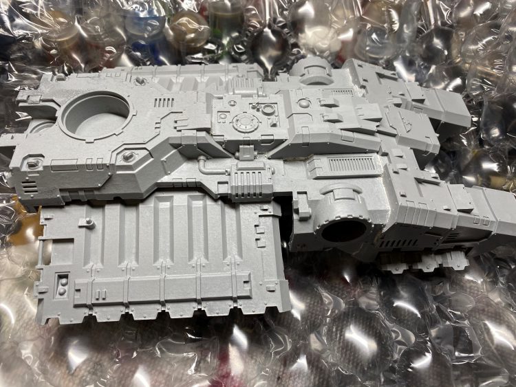 There are a lot of parts to clip and scrub. Credit: RyolnirFrom there, it was assembly time. I used BSI Super Glue & Accelerator as a 1-2 combo to make these big ass resin pieces fit together. A really smart thing I never thought of (which is literally in the instructions for all Forge World products, of which I own several) is to spray the accelerator onto one piece and put the super glue onto the other. Am I the only one who has been doing this wrong? With something this big, you'll want to dry fit it multiple times to check for gaps, and you will have gaps. You can sand + saw things down and use some Vallejo Plastic Putty to fill the big ones. In general, try to get things as smooth as possible using sanding sticks and the like, so you can have a nice surface to paint on. This took a lot of work, but was worth it. I recommend not gluing in the turret, repulsor plates (until the end), void shield, engines, and of course sponsons, as well as the impossible-to-remember-it's-there rear-mounted Storm Bolter. Though this may seem like a lot of stress, I was actually pleasantly surprised how few actual problems this tank gave me. Jack and Silks both assured me it was a pretty straight forward build and they weren't kidding.