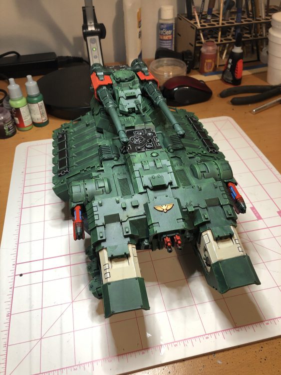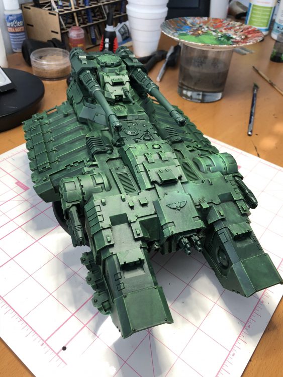 Dark Angels Astraeus. Credit: Greg ChiassonThe hull and turret were primed with Army Painter Angel Green (equivalent to Caliban Green), and the pusher plates and Accessories were primed metal.