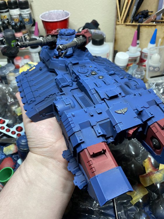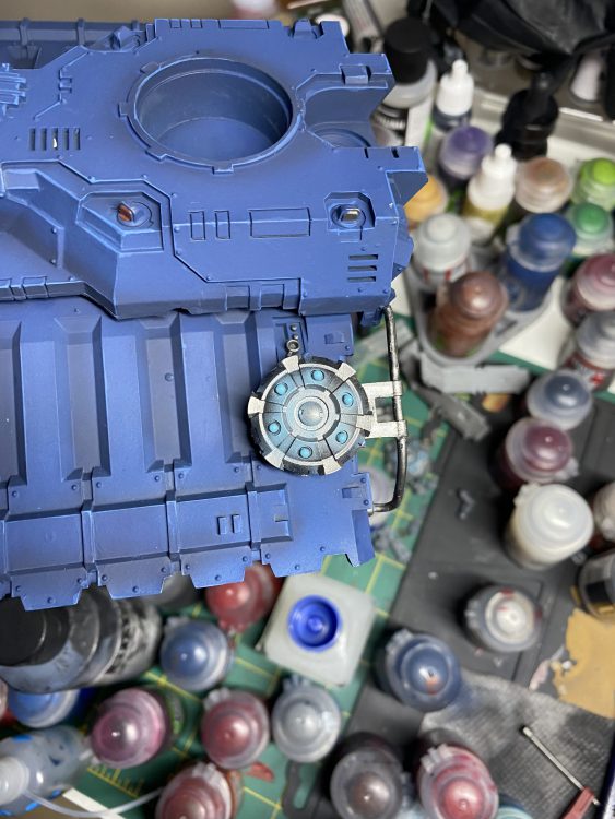 - Blue Highlight: I used a thinned down (with Vallejo Flow Improver as I like the gel consistency for highlights) Alaitoc Blue for my highlights. Usually I go back over the most important highlights with Hoeth Blue, but I completely forgot like an idiot... I may actually go back and do this. I personally held the tank in one hand against my lap and rotated it, as it's absolutely a huge dinner plate of resin.