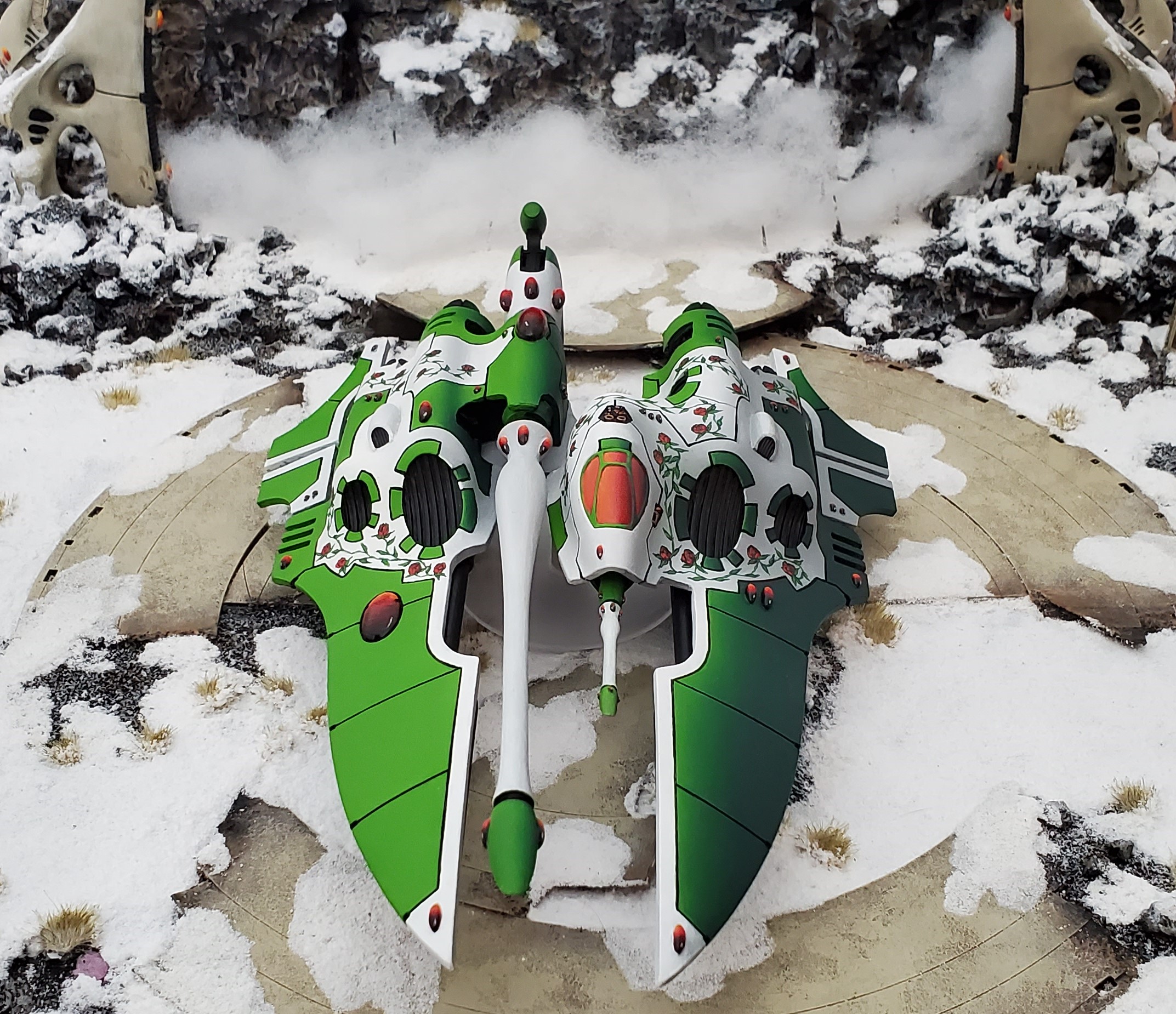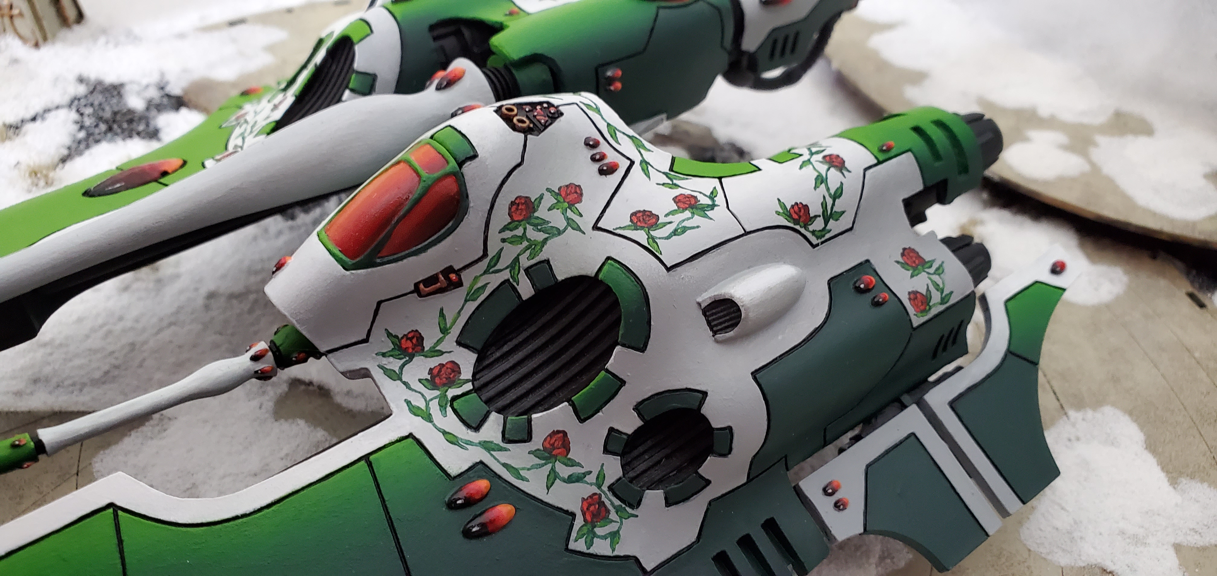 With the gems I target half of it to be black or black/red which will then blend up to Fire Dragon Bright at one tip - as usual I'll lay down the layers or 'layer it up' from dark to bright, then blend them 'back down' from bright to dark. Afterwards I'll place a white dot, or a thin dot + line in the black portion, depending on the gem. After the gems, I'll start to lay down the roses. I decided to go with roses a long time ago - mostly because I hated the thorny vine look of the traditional Biel-Tan look but wanted to give it that Biel-Tan tie - so I one-upped the Craftworld and added leafy vines with roses. The roses start at the center with an upside down V and then I'll work outwards with overlapping black lines. I'll then fill in with Mephiston Red, highlight with Wild Rider Red, and then add the curvy vines with Caliban green and highlight with Moot Green. The nice thing about putting Caliban Green over the white of the hull is that Caliban Green doesn't actually cover all that well, so Moot Green highlighting actually gives it a lot of depth between the darkest portions and the lime-like color of the Moot Green.