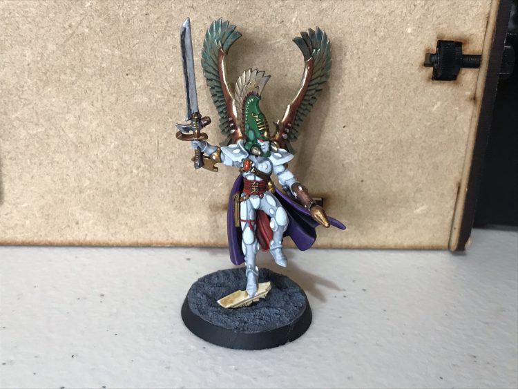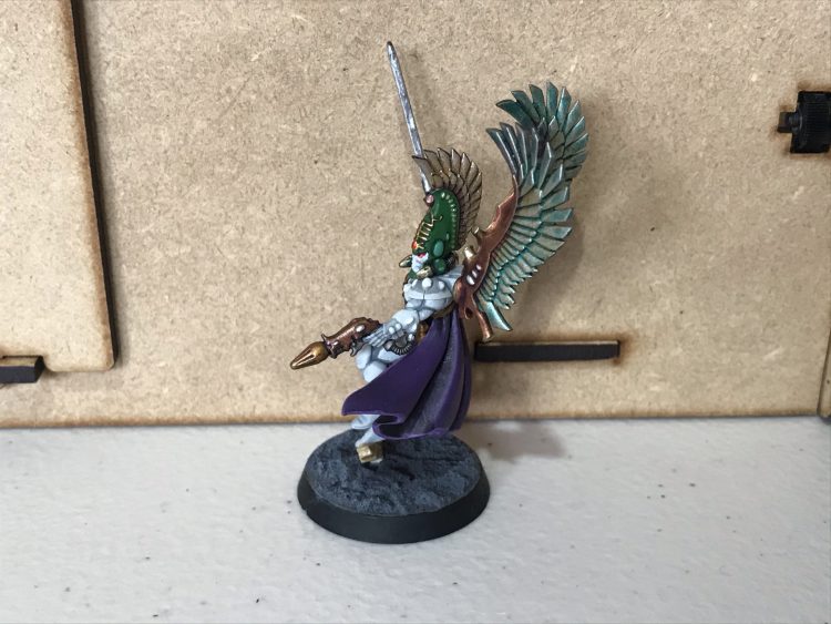 1.) Assemble the body but leave the helmet, cloak and wings off. Spray this Grey Seer, then block in any future metals (i.e. the sword, the gun) with thinned Black Templar.