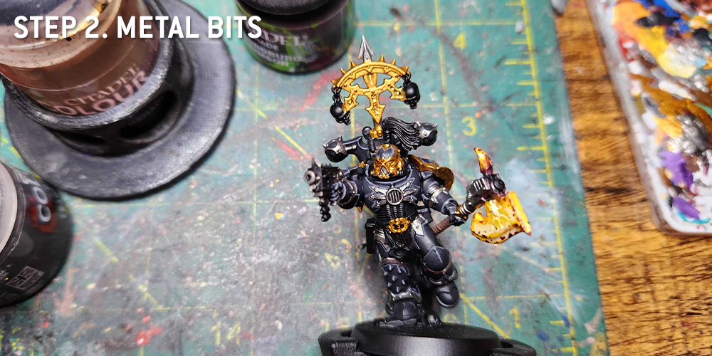 This is a big step, and it's a two-part process. First I use a 5/0 brush to edge highlight the black portions of the model with Mechanicus Standard Grey. This is a meticulous process, but doing it before the trim makes it easier to fix any mistakes since it means just touching up the black armor. Once that part's done I go through and do the metal trim and any other metal bits on the model. This guy is an aspiring champion for a regular unit, so I did silver trim on his body (Leadbelcher) and gold trim (Retributor Armor) on his shoulder pads and helmet.The Axe