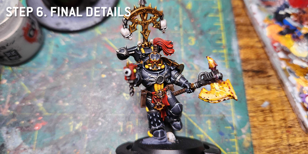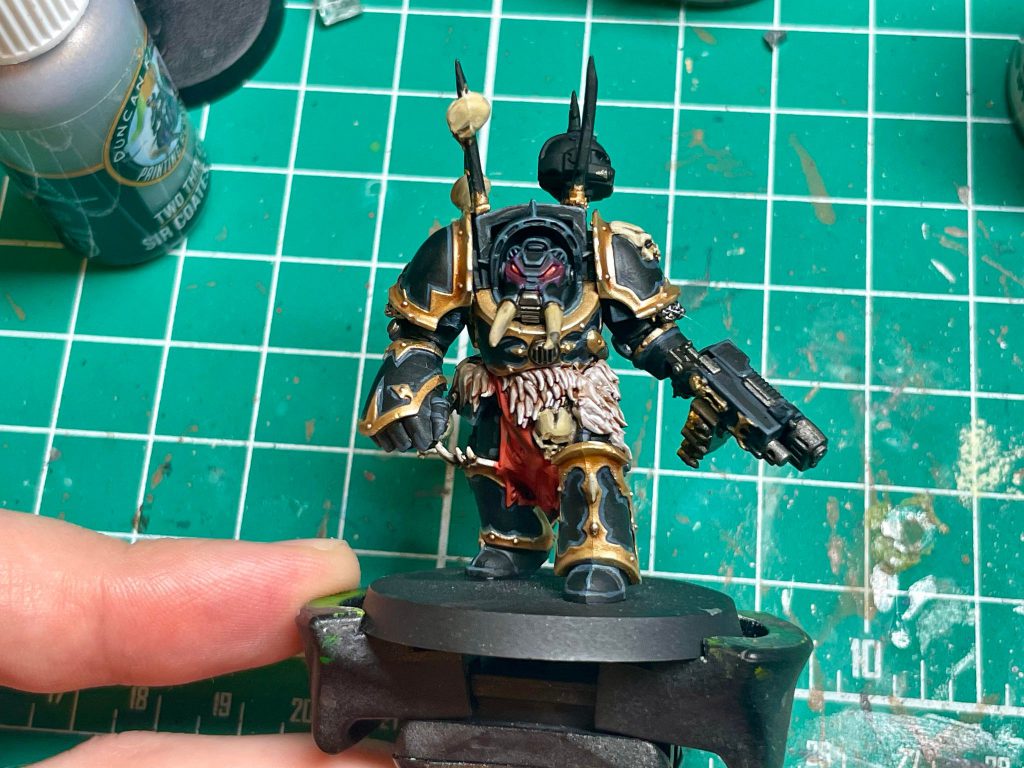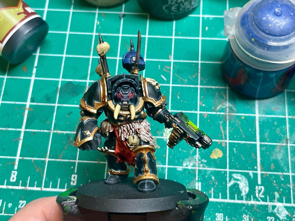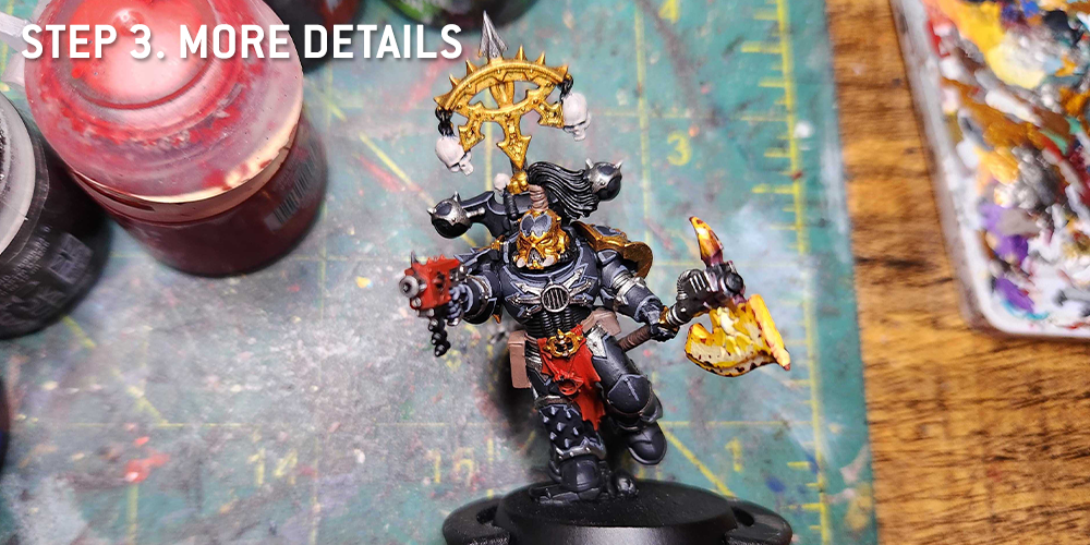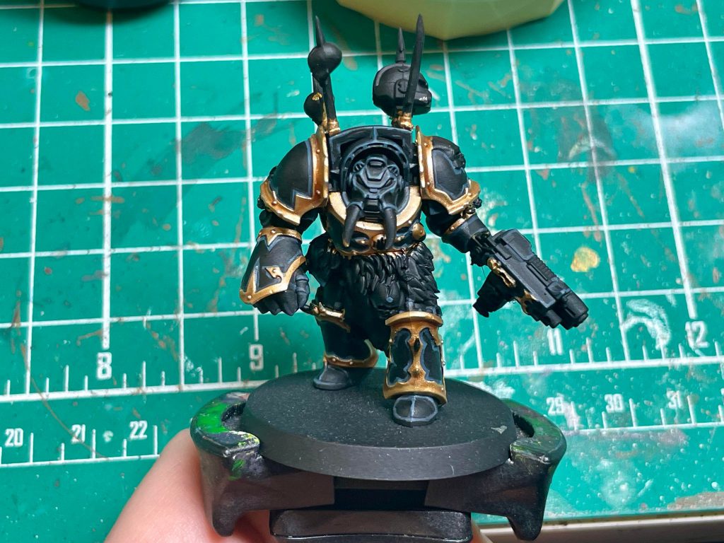 For the trim, I prefer a brighter gold for my Black Legion. I do this by basing with Retributor Gold, and then layering on Duncan Rhodes Glistening Gold/Liberator Gold. If you don’t have access to the Duncan Rhodes paint, Liberator Gold works just fine, but Glistening Gold is an easier paint to work with in my experience.
