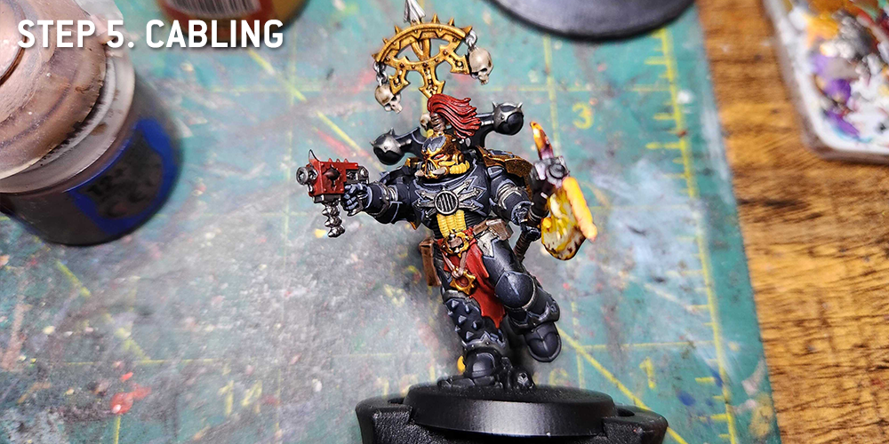 Before we get to the final details we have to address the power cabling. I do bright orange and yellow cabling for my Black Legion guys, similar to the 2nd edition scheme, though how I do it is a bit different here than in my 2nd ed scheme model. If you wanted, you could do it that way (paint wraithbone, wash with Iyanden Yellow Contrast Paint), but here what I do is paint the cables with Averland Sunset, then wash them with Fuegan Orange. After that I come back and highlight the raised parts with Averland Sunset and Flash Gitz Yellow.