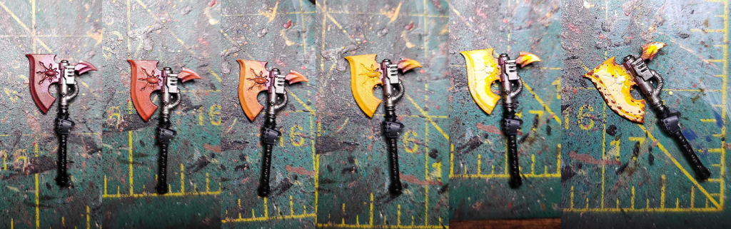 You start with the axe painted Leadbelcher, then blend that into Khorne Red. From there you start highlighting, leaving visible edges, going to Evil Sunz Scarlet, Fire Dragon Bright, Flash Gitz Yellow, Dorn Yellow, and some Reaper Pure White. The center of the axe is going to be the brightest/hottest here, with the yellow/orange/red transitions toward the edges. You want the reddest spots to be toward the axe, with some yellow/orange along the other edges.
