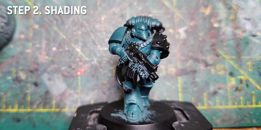 Next up it's time to shade that armor. I'll highlight the black parts - particularly the shoulder pad - with Corvus Black, and mix it with Black Legion Contrast to do progressive shades to make a smoother transition.For the armor I take a similar tack. I'll shade the darker parts with a mix of Sons of Horus and Terradon Turquoise Contrast paint. In similar fashion I'll come back and do progressively darker mixes to great a smoother transition and blended effect. Terradon Turquoise will also be perfect for hitting the recesses, though Drakenhof Nightshade will also work for that in a pinch.