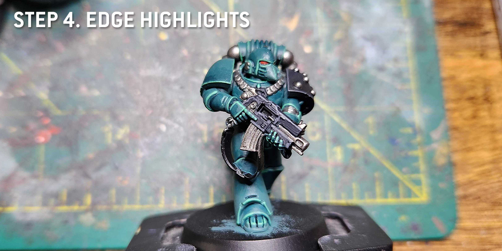This is where it comes together and the model really starts to pop. I edge highlight the armor with Sybarite Green. The black parts - the shoulder pad and gun - get an edge highlight of Mechanicus Standard Grey.