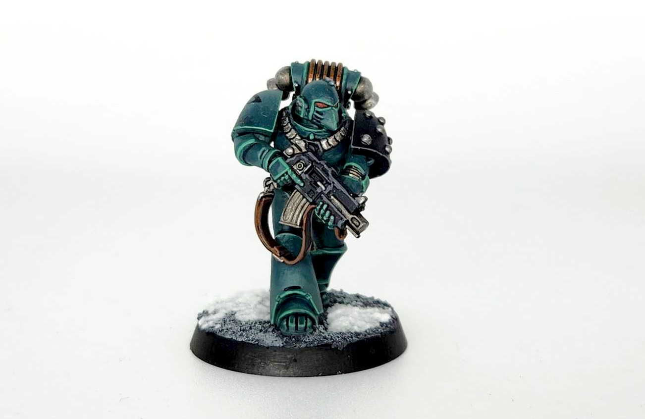 Time to add those finishing touches. The metal bits get washed with Nuln Oil and then edge highlighted with Runefang Steel. The leather strap is Mournfang Brown washed with a mix of Agrax and Darkoath Flesh contrast, then edge highlighted with Cygor Brown. The coils on the backpack are Balthasar Gold with a slight shading of Agrax Earthshade.And that does it. The shading is a bit more complicated than I've done on most Heresy marines, but the overall effect is worth it, and it's fairly easy to paint Sons of Horus that look great - it's a very pretty scheme and shade of blue/green to work with.