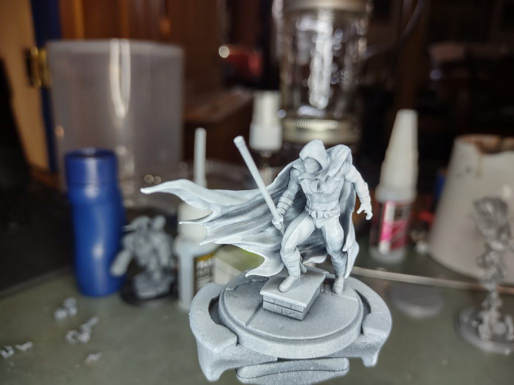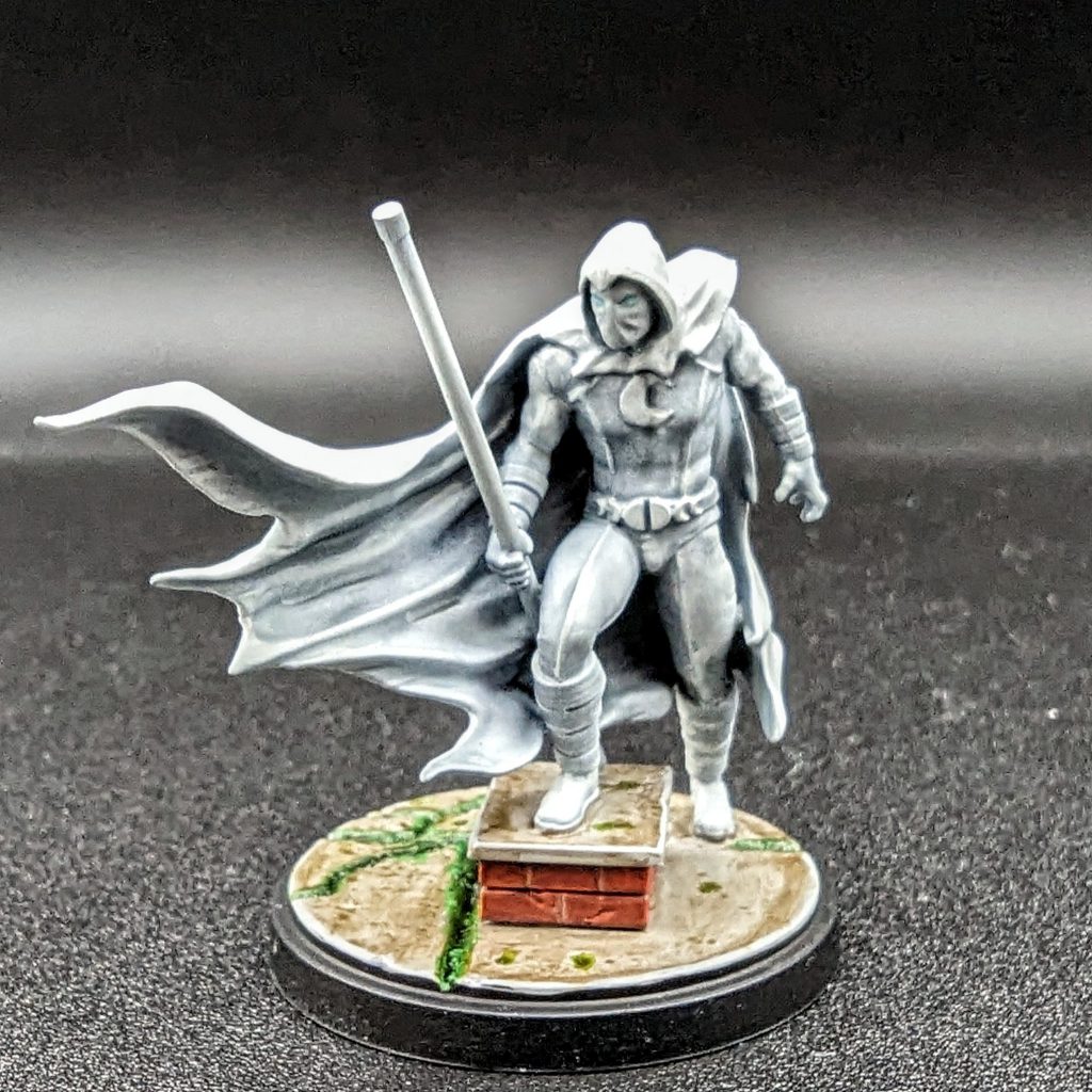 Starting with Moon Knight, the process was pretty simple. I decided to undercoat the man with a 2 steps of a zenithal highlight. I primed him with Chaos Black, and sprayed a lighter coat of Mechanicus Standard Grey from above, making sure to keep the deepest recess black for heavier shadows. Then I did a zenithal highlight with the White Scar spray heavily from behind and lighter in the front. This did 90% of the work of painting him and I was really happy with the gradient I got using those 3 colors.