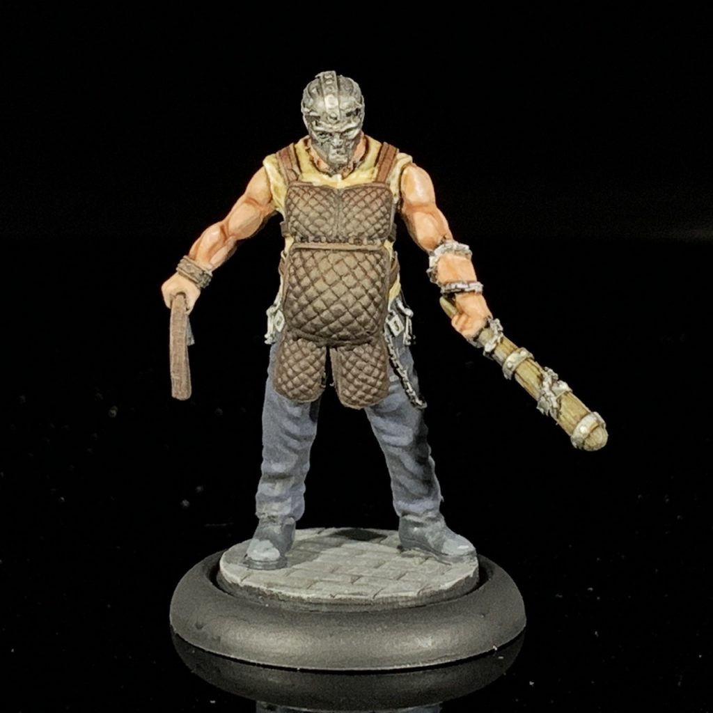 The truncheon took me a little longer than I initially planned as I wasn't totally happy with the initial colour. Wood is often shown as being dark brown in table top games but unless it's been stained it's not actually dark brown all that often. I started with a light sand colour and began adding subsequent washes of Agrax Earthshade. I wanted to be able to control just how dark the truncheon ended up and I'm fairly happy with where I wanted on this one. For the mask and other metals, I used the same VMA Steel and went with a heavy Agrax wash for the helmet. I brought the most raised areas back up with a quick drybrush but overall wanted to keep things subdued.