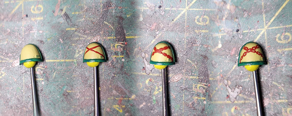 For the dark green helmet stripe and the pauldrons, I did a basecoat of Kabalite Green followed by an edge highlight of Sybarite Green.