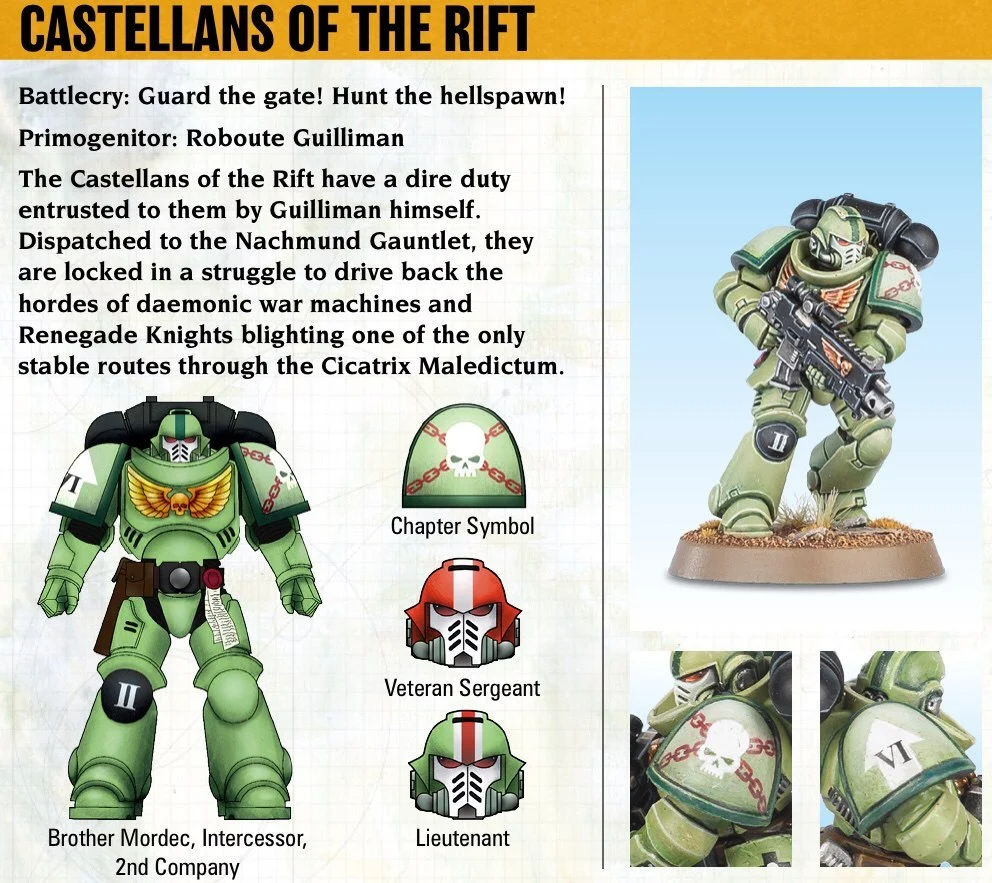 The Castellans of the Rift are an Ultima Founding chapter comprised entirely of Primaris Space Marines. Their primary mission in the lore is to defend the Nachmund Gauntlet, a relatively narrow stretch of the galaxy which acts as the only safe passage across the Cicatrix Maledictum. If you want to cross the massive warp storm separating the Imperium from the Imperium Nihilus, you've gotta get through them.