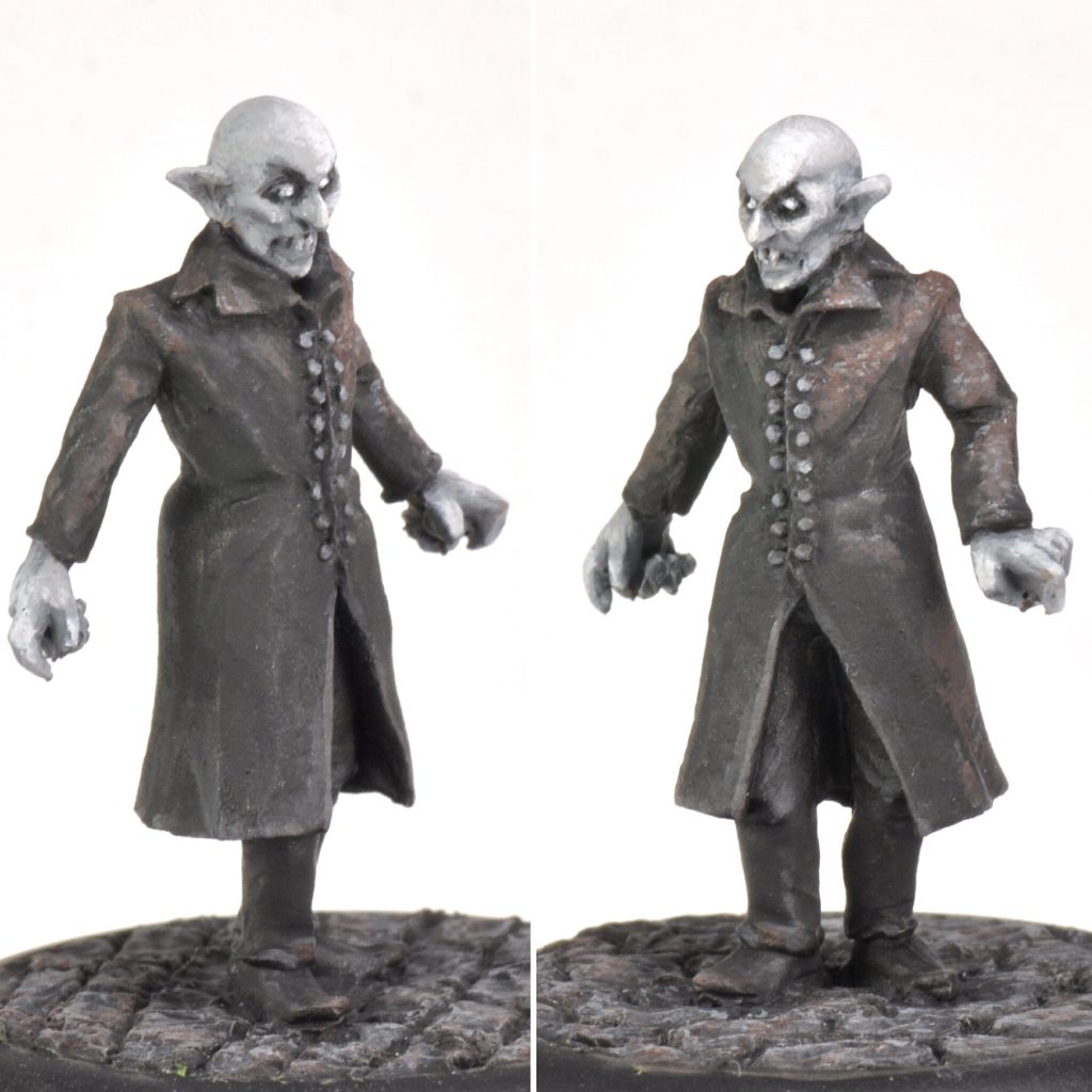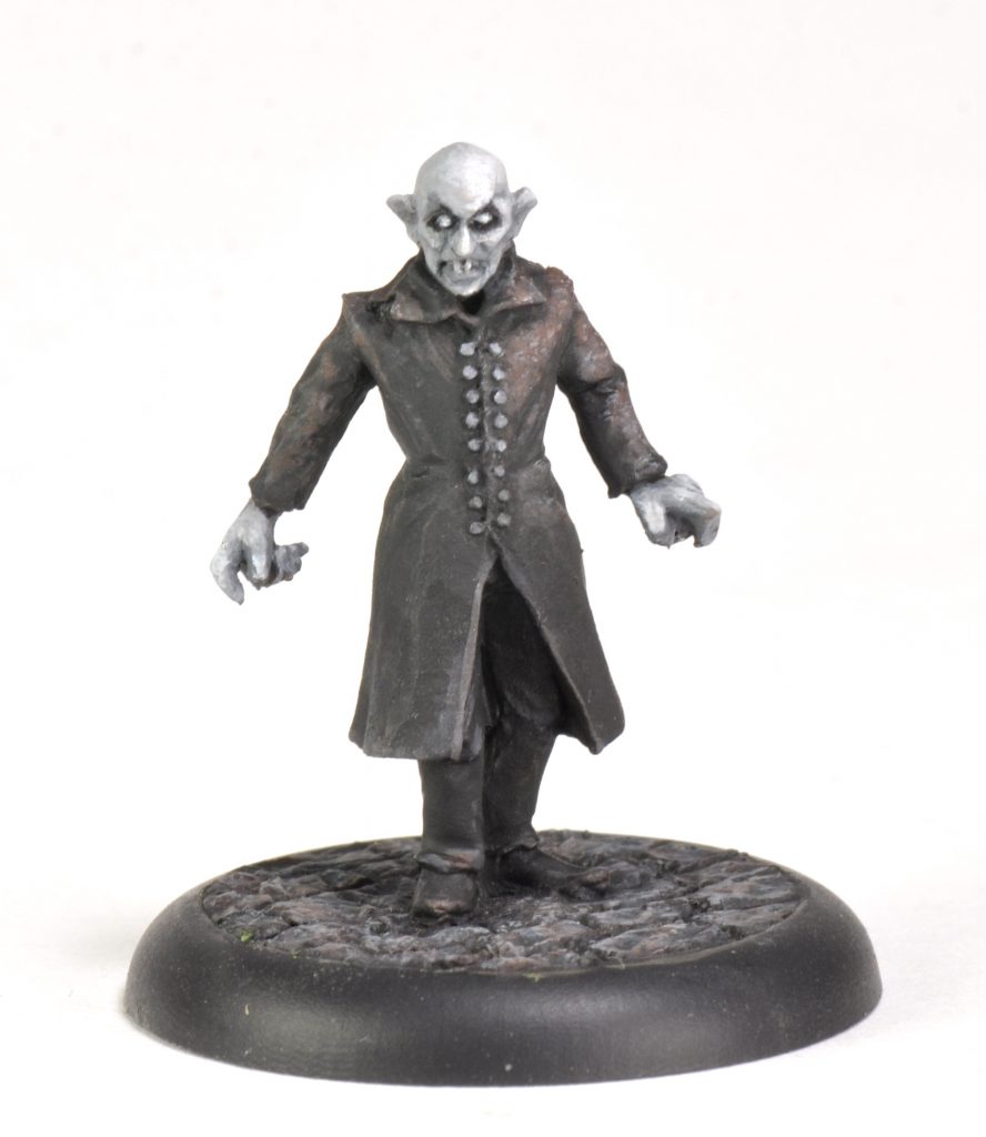I used this still from the 1922 silent film 'Nosferatu' as a reference photo. Max Schreck plays Count Orlok in this unofficial adaptation of the 1897 novel 'Dracula'. The film is pretty great, I highly recommend seeing it. The miniature is a pretty good representation of this creepy bald vampire.