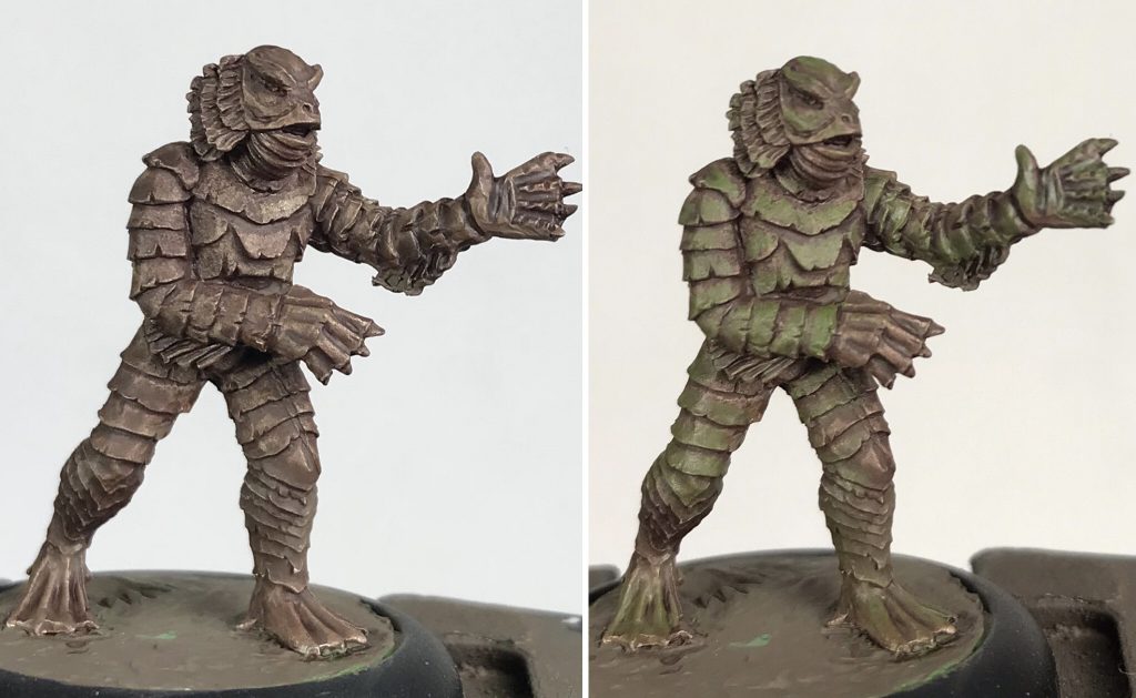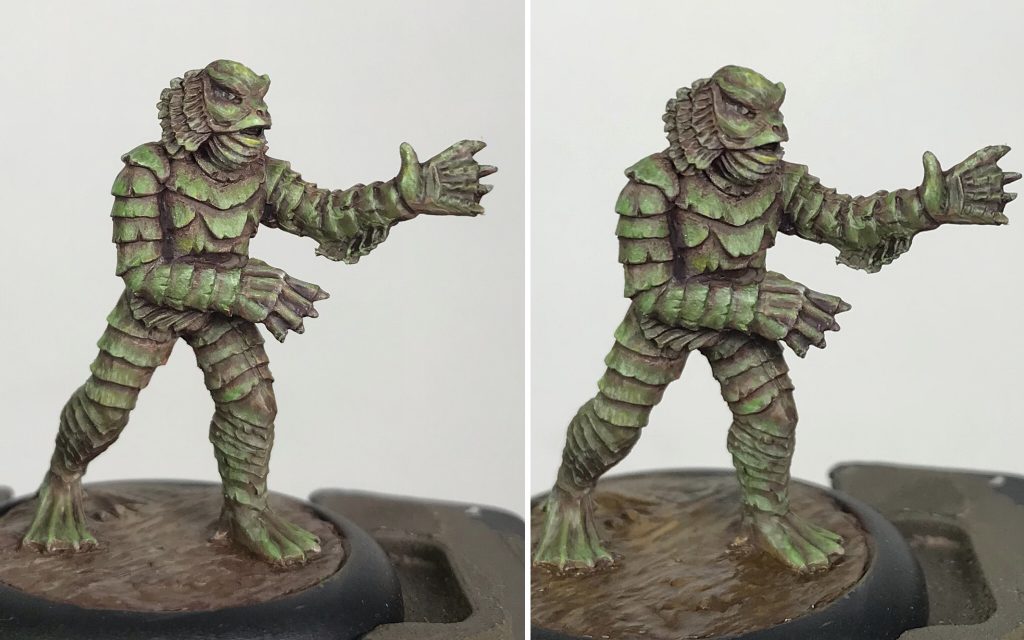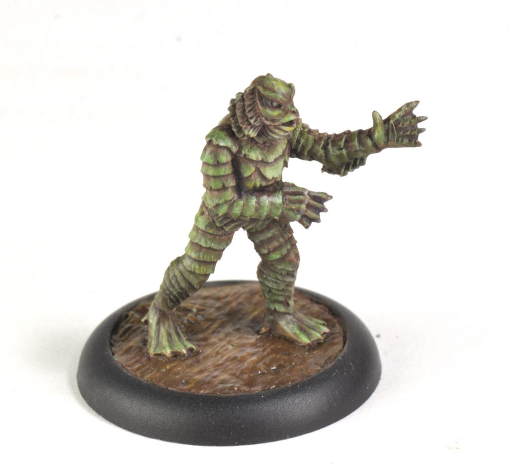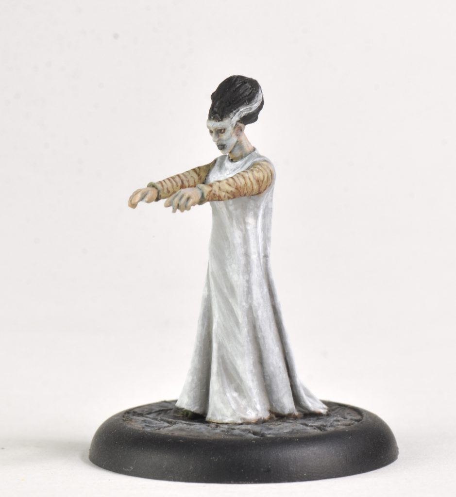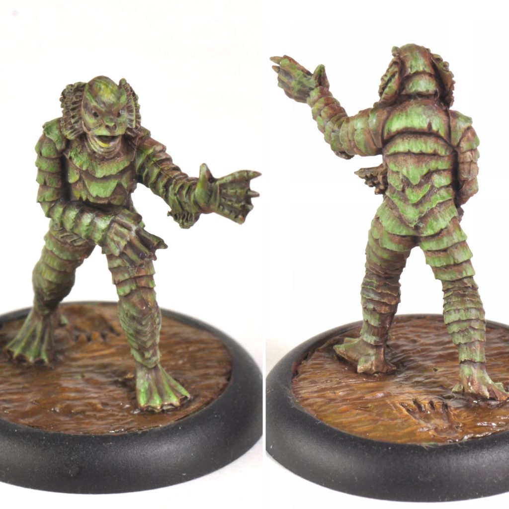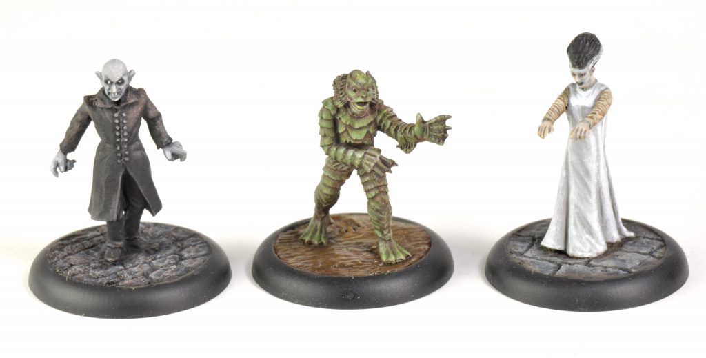 Nosferatu, Creature from the Black Lagoon, and Bride of Frankenstein. Credit: SkailsSkails here, running through how I painted 'The Vampyr', 'The Creature', and 'The Bride' by Studio Miniatures. They paint up fast for my speed, being about three hours each. Their bases were slightly recessed, so I used greenstuff to sculpt the ground. For the stone it was roughy pressed flat to be level with the edge of the recess. Then cracks were made in lines by pressing a flat tool into the surface. The mud for The Creature was done similarly, but instead of making cracks I dragged the rounded end of a tool across the surface repeatedly to make a wavy surface.