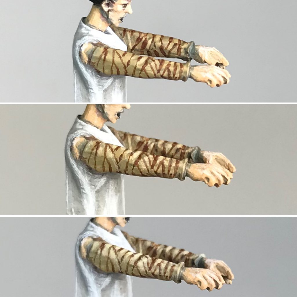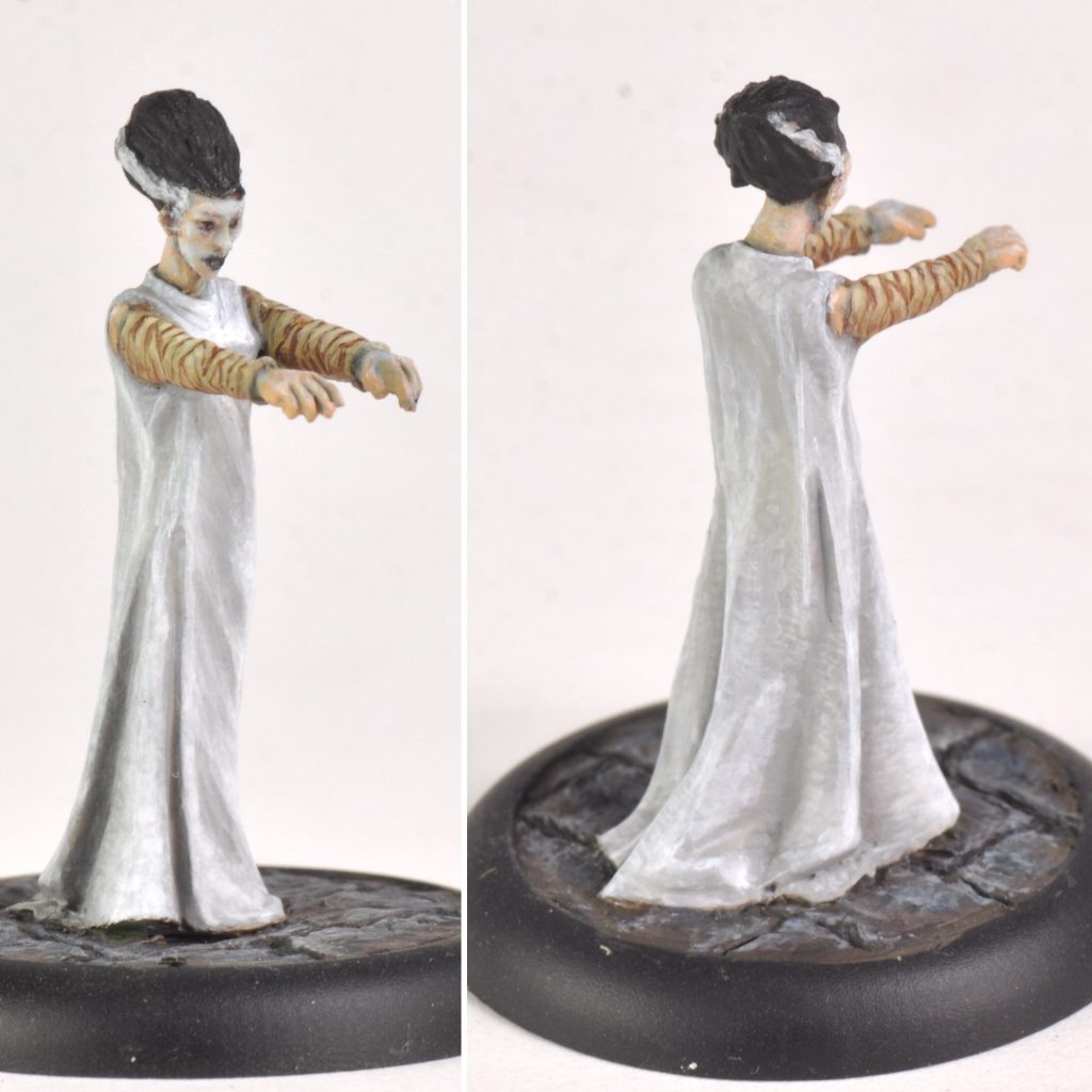 This miniature has arms that appear to be covered in sleeves. In the movie her arms are wrapped in bandages, so I painted the wrappings on. To begin with the arms were base coated to a solid consistency with Zandri Dust. Then lines were painted on with Mahogany. My goal was to keep from having too many parallel lines. Two or three were painted at the same angle, then a few more at a slightly different angle so that they appeared to overlap.(Top frame) Next the top portions of the wraps were painted with Ushabti Bone. (Middle frame) Then a smaller portion of that highlight was painted Screaming Skull. (Bottom frame) Finally a mix of Ushabti Bone, Mahogany, and glaze medium was painted along the bottom of arms.
