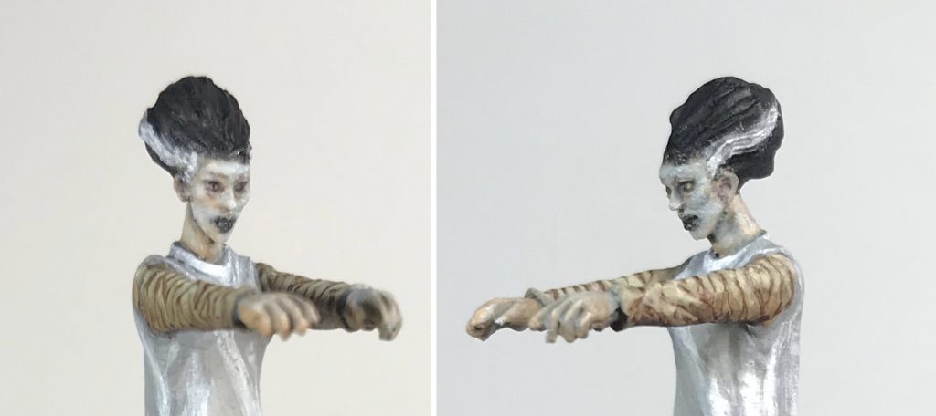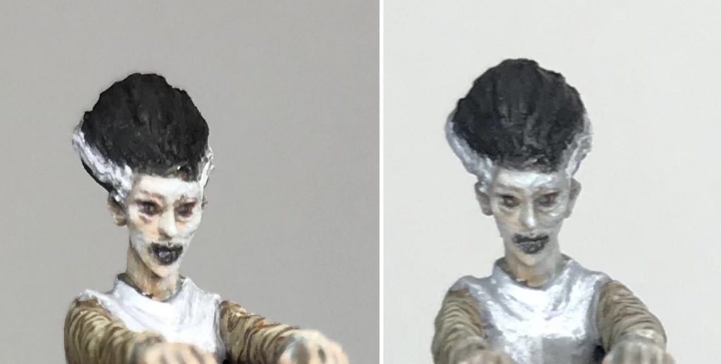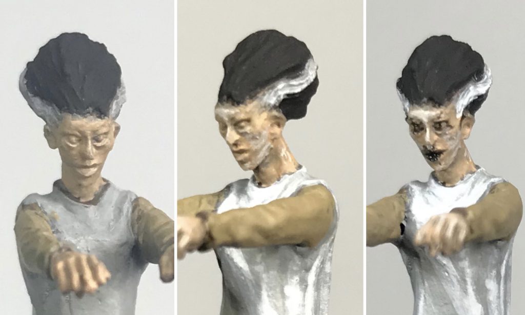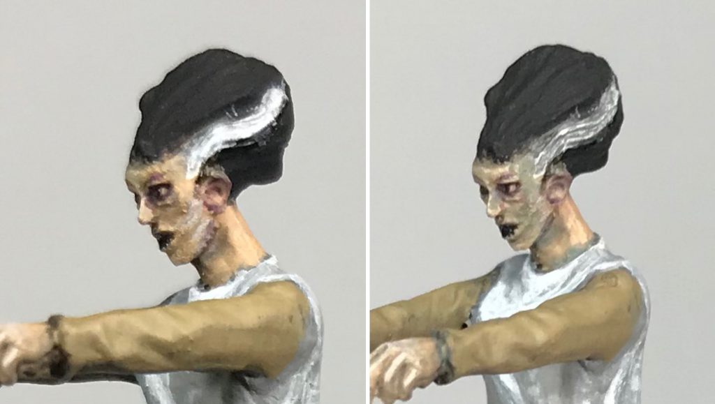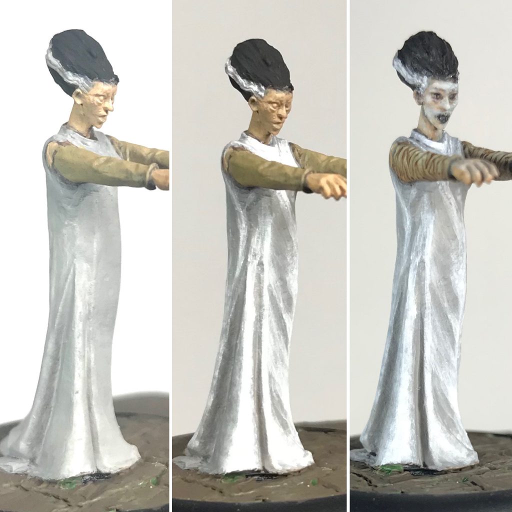 The dress was first given a few layers of Stonewall Grey until it reached a solid coat. (Left frame) Next Dead White as built up in thin layers where I felt the brightest highlights should be. These were placed loosely where they are in a movie still and also according to the folds on the miniature. (Middle frame) Finally a Stonewall Grey and Dead white mix (somewhere in the 1:1 range) plus some Golden's Satin Glaze Medium was used to soften the transition between the first Stonewall Grey layer and the Dead white layer.