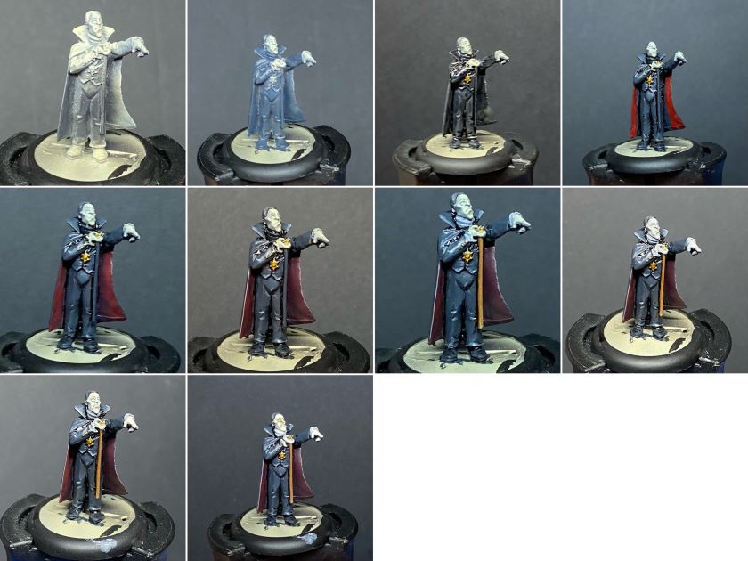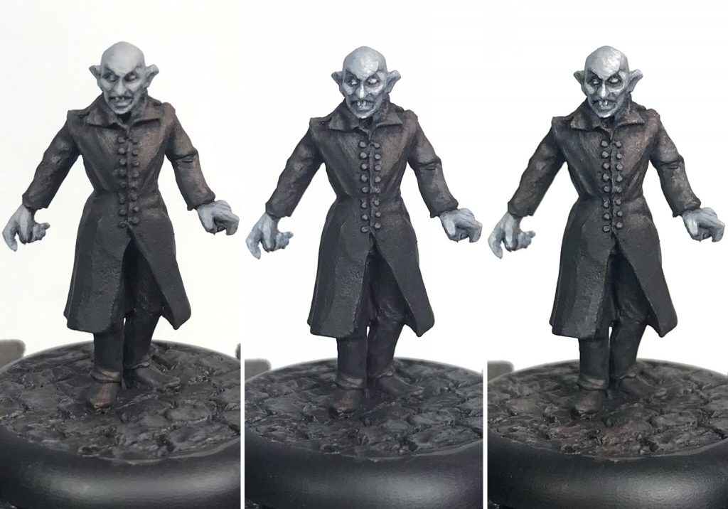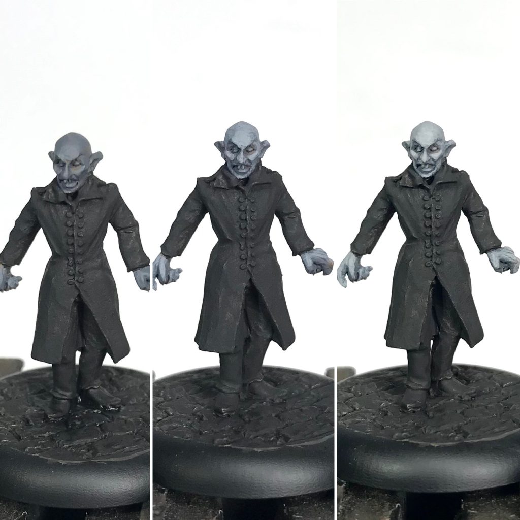 Dracula started with a black prime, this was zenithal highlighted up with a warm off-white.