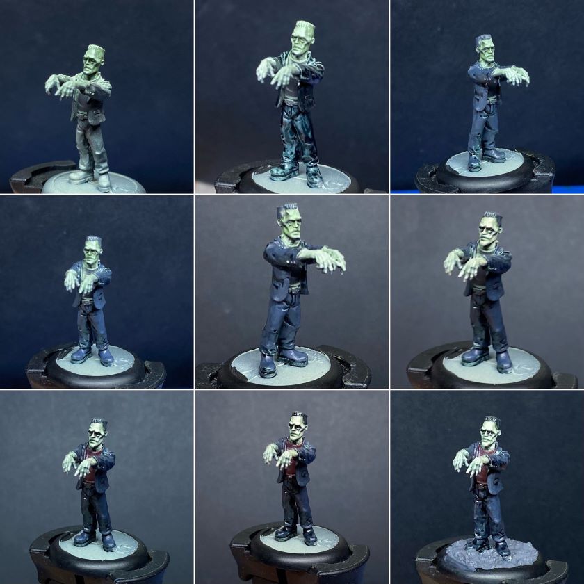 His clothes were blocked in with the same dark grey as I used for frankenstein, this was then washed black and then cleaned back up with the same grey, some edge highlights were applied to this using a brighter grey.