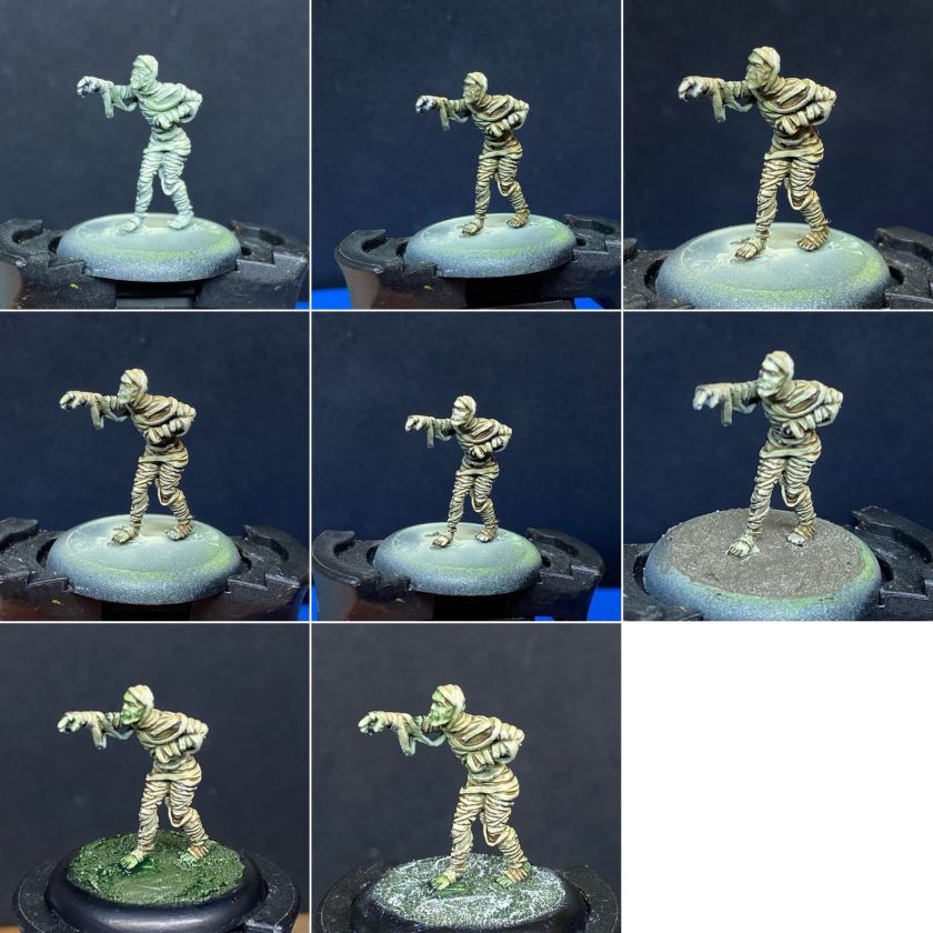 A sepia wash was used to shade the bandages, quickly bringing them into the colour profile we want while still retaining a greenish hue in the shadows. Next a dry brush of a bone colour was used to highlight the bandages and push the contrast back up.