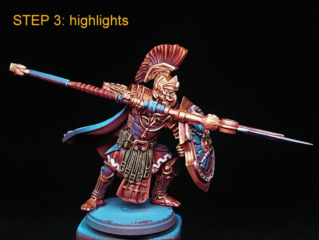 There’s no nonsense here, highlights are just something you need to practice brush control to do quickly and neatly. I do find a little drying retardant very helpful though. I wet blend some of the highlights on areas like the cloak from a glaze-like consistency towards a more pigmented highlight mix. As for the base colour step I leave the metallics until last. Darker blue areas like the armour are highlighted with VMC Turquoise moving towards white, lighter blue areas like cloth are highlighted from VMC Blue Green : White, 1:2, towards white. In both cases I try to only have three highlight mix steps maximum to save time and force myself to be brave. The white areas are highlighted with white, while the leather is highlighted with a 1:1:1 mix of VMC Chocolate Brown, Flat Earth and Dark Sand, trying to add a bit of leathery texture. Red areas are highlighted from VGC Gory Red mixed with S75 Primary Red, to ~1:1 S75 Primary Red : S75 Primary Yellow, with white and extra yellow added for a final highlight step. The metallics are highlighted from VGC Brassy Brass, to 1:1 VGC Brassy Brass : AP Shining Silver, to AP Shining Silver. I don’t highlight the skin areas on any of my city states minis at this stage for this scheme, the logic being that hopefully the highlight at step 1 under the wash from step 2 is sufficient.