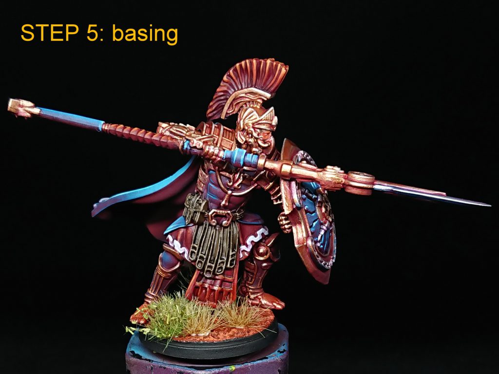 Gradations in the cloaks coming up nicely. Credit: Magos SockbertI started painting the model with the cloak, which I painted with Akhelian Green for the cloak, washed with Coelia Greenshade, and then drybrusehd with Adriatic Blue from Scale 75, before a highlight or final light drybrush of Baharroth Blue, whichever felt more appropriate for the importance of the model I was painting. On to the armour! Now, I’m quite good at painting metals; my 40k primary army is Minotaurs, and my 30k army of the moment is Iron Warriors, so I thought I’d do things a little differently and go with a more ceramic vibe. As such, Skeleton Horde was my go to Contrast paint, highlighted by Screaming Skull on the heroes; be careful here, as Skeleton Horde is notorious for pooling badly in ugly gloops. Straps and pteruges (the sort of dangly strap things) were Gore-Grunta Fur and the skin was Guilliman Flesh, and the spear tips were Vallejo Metal Dark Aluminium washed with Nuln Oil Gloss, my standard steel look.