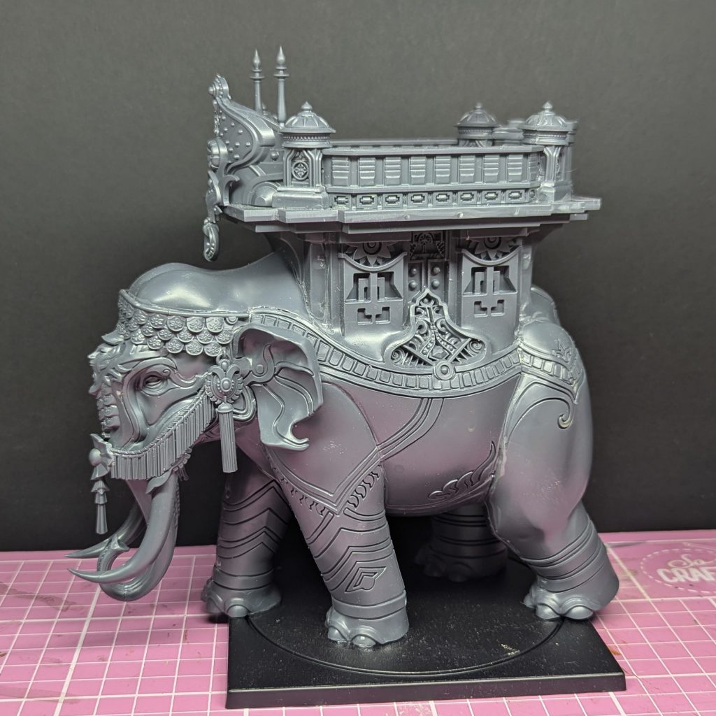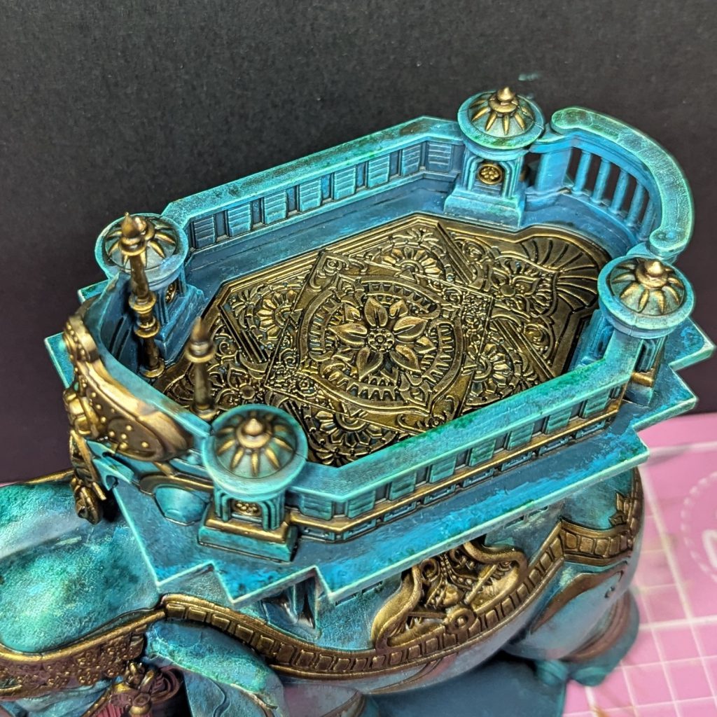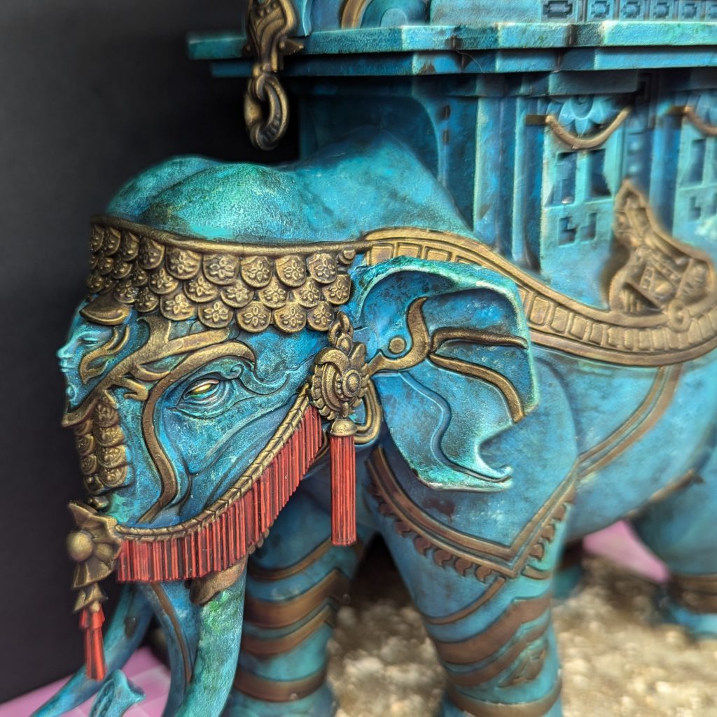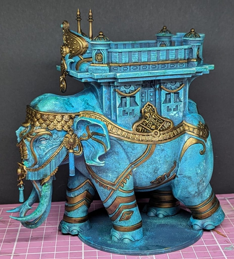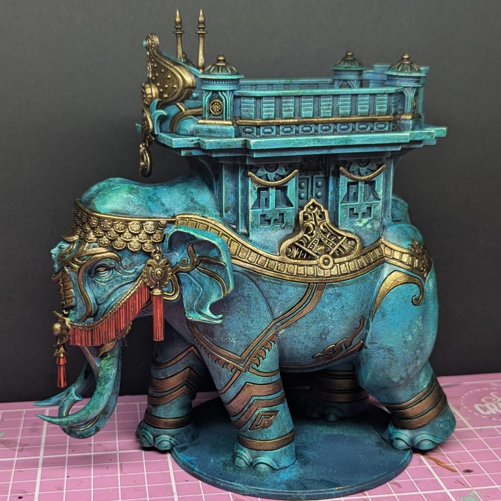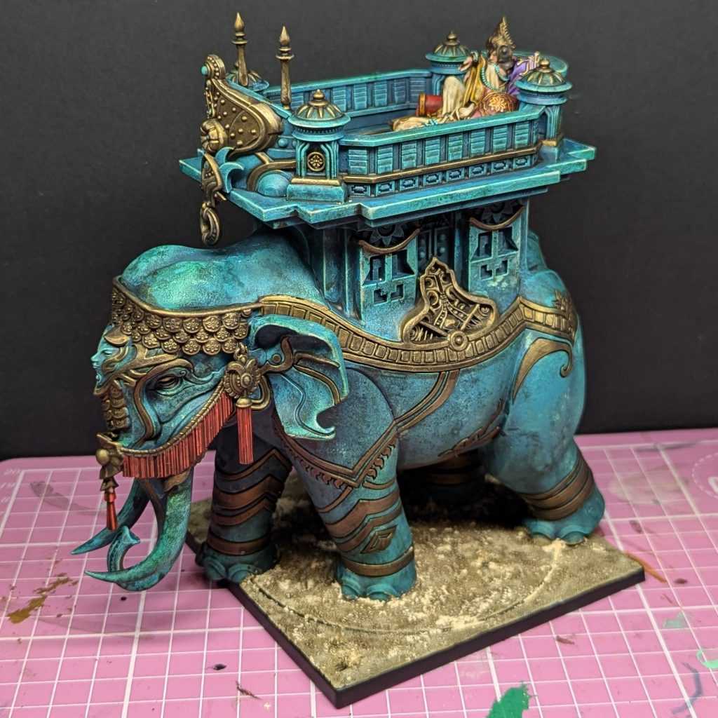 Mahut with gold added. Credit: Rich NutterAfter doing the gold, I decided to paint the inlaid pattern in the howdah in the same way. I was tempted to do a bright multicoloured mandala effect, but in the end I thought it might clash with the green of the body and so I settled on something that would definitely match.