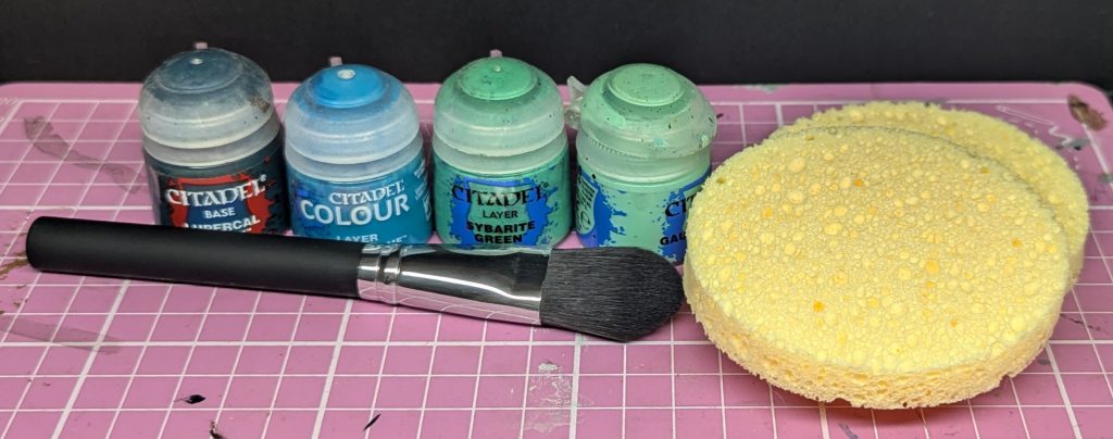 Materials gathered for a messy painting session. Credit: Rich NutterI opted for Lupercal Green followed by Ahriman Blue to fill the gap, before moving back into Sybarite and Gauss Blaster. I was keen to replicate a marble or stone like texture, but didn't really want to spend a long time doing this by hand, so I opted to dab on colours with some natural sponge, supplemented by a big drybrush for some of the sharper areas like the howdah. This is a great way of covering large areas quickly, and also adds some interesting texture to the flatter parts of the model. After the Ahriman Blue it was already feeling very blue (go figure) so I switched to the big drybrush rather than sponging all the way.