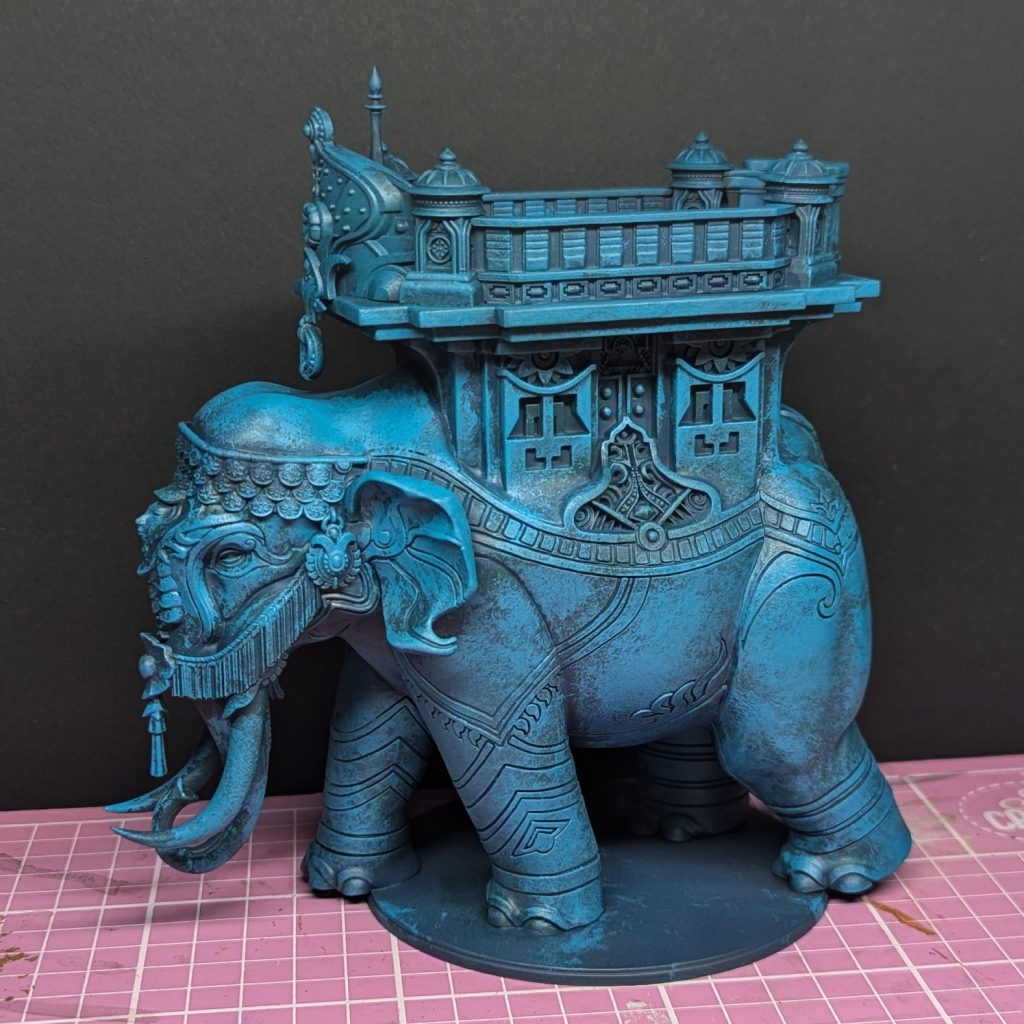 The Mahut is a truly imposing model. It's huge! Para Bellum's studio model is beautifully painted in a smooth off-white scheme. However as I'm still trying to get this army painted, I'm going to focus on some techniques and shortcuts to get it to the table in a decent amount of time rather than go all-out on a parade-ready piece, and step one of this plan is choosing a different colour for the main body. My Sorcerer Kings wear a lot of blue-green gems that could be jade or malachite, and it makes sense to me that they might also choose to build a devotional statue to a beloved steed out of similar semi-precious materials, so I settled on a blue-green stone scheme. To save time at the start, I basecoated with a spray of Drake Scale Green from The Colour Forge (which I think they might have discontinued recently).