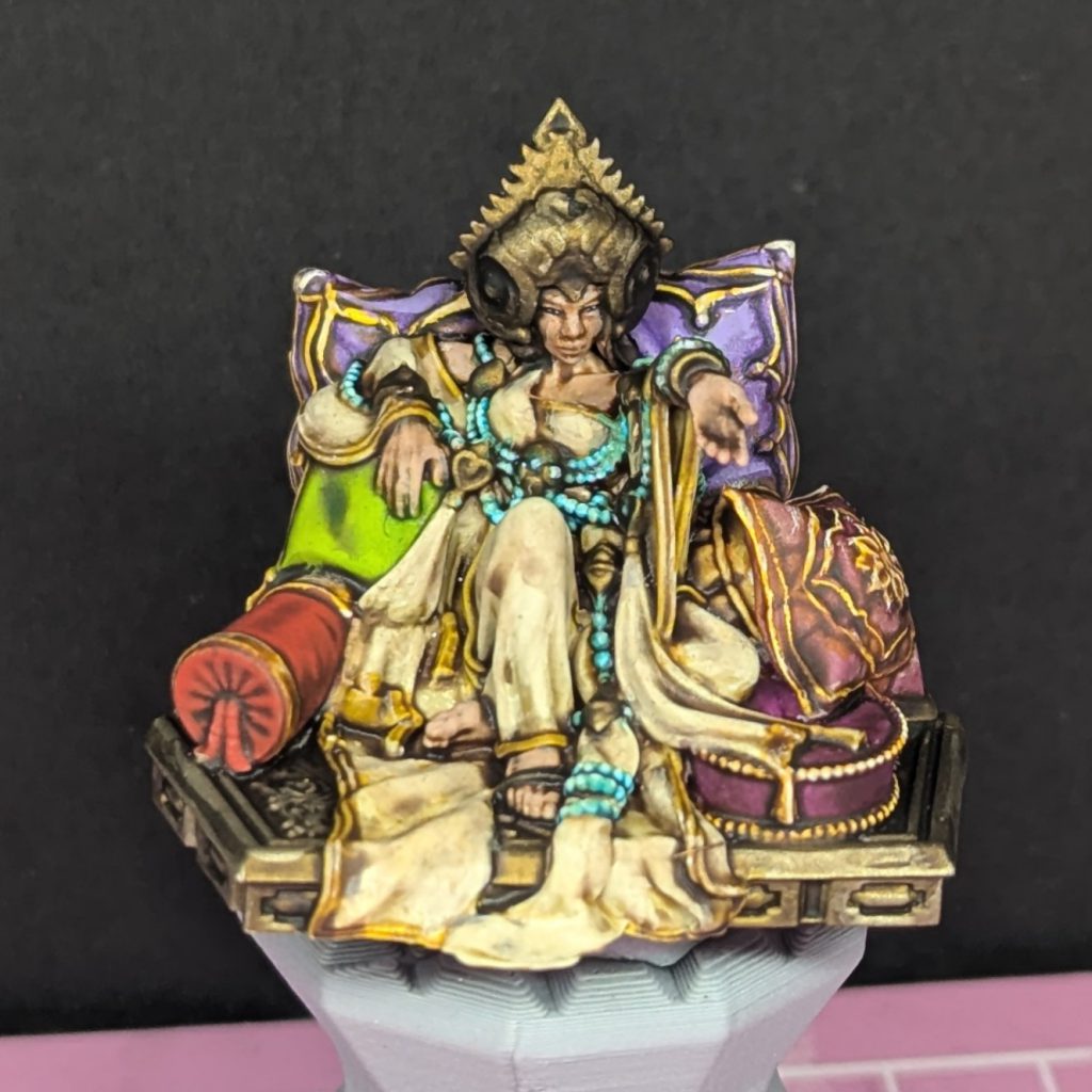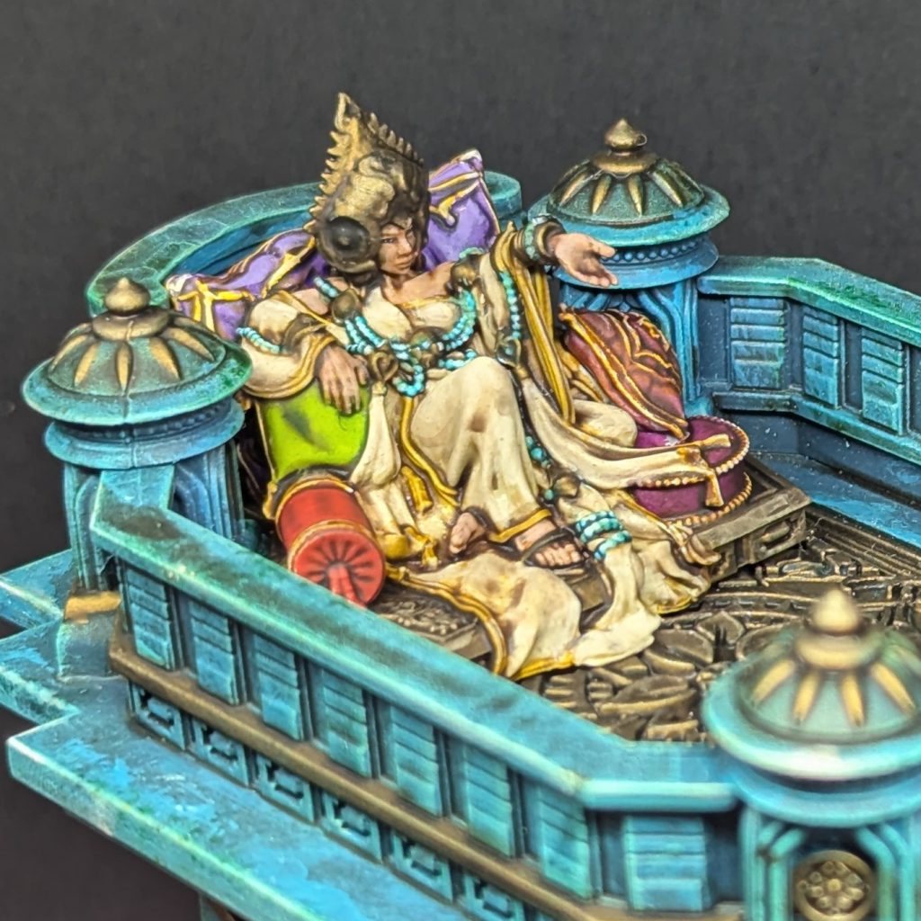 Favored of Hormus. Credit: Rich NutterShe was painted like my Maharajah on foot, with light robes and plenty of malachite gems and beads. The plinth is painted the same gold as the rest of the detail on the elephant, so that it fits in when the model is slotted into the howdah. I opted to put some brighter colours around her on the cushions - I picked a variety of bright contrast paints, then mixed in a bit of white to each for the highlight step.