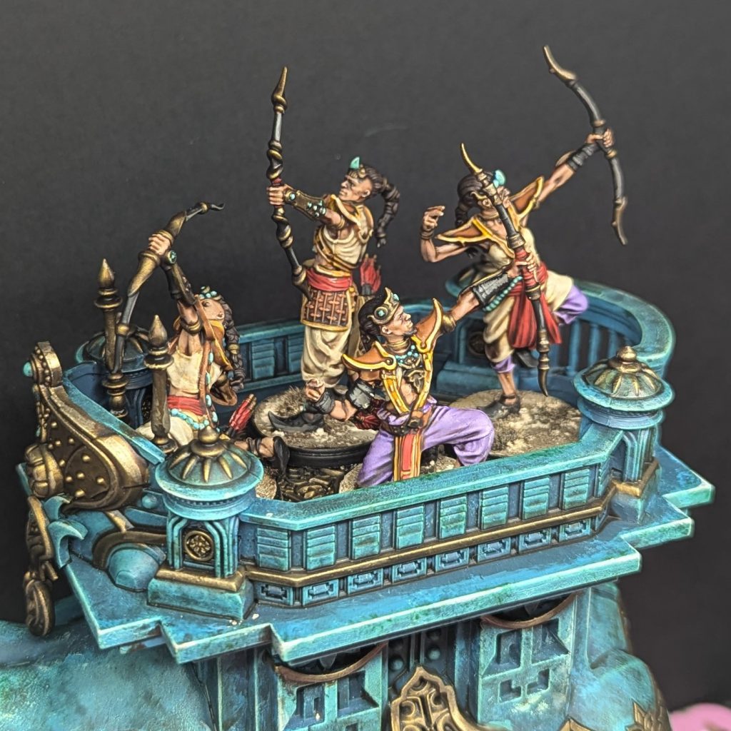 Normally the Mahut is crewed by four archers, which are models from the Dhanur Disciples kit pulling double duty. These are included in the Mahut kit, and the box also comes with a square sabot base for them, so they can also be used to expand another unit of archers if preferred.