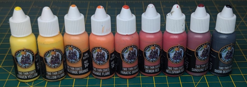 Efreet fire. Credit: Rich NutterIn short we're basecoating our flame white, then all over (or almost) with a very bright yellow, before drybrushing up through a spectrum of yellow-orange-red-black and washing some thin white back into the hottest spots. I used these Two Thin Coats colours.