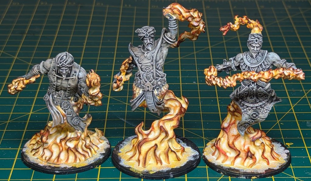 Preshaded Efreet Flamecasters. Credit: Rich NutterTo be honest, in the future I might consider just spraying the models a flat ivory colour, or perhaps a cork colour followed by an overspray of ivory. Conquest models are big enough to make this drybrushing stage feel like it's taking a very long time, and ultimately not much of it will end up showing through. Do whatever makes sense with the tools you have available!