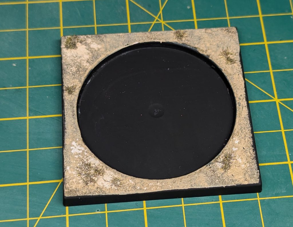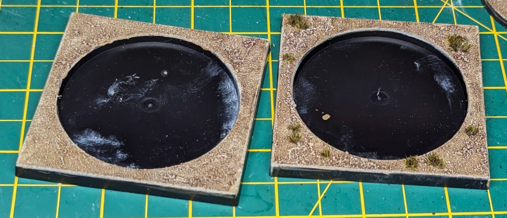 The bases are pretty simple. I start with Armageddon Dust texture paint, drybrushed with Screaming Skull and washed with the marine juice from above. Once that's dry I place down some plants, in my case tiny tufts from Gamers Grass. I haven't been consistent with colour, because of the next step.