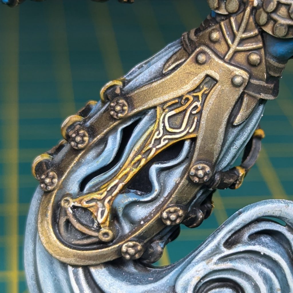 This metal has seen some use, but it's well looked-after. Credit: Rich NutterThe gold is a basically the same principle. Gold armour and trinkets are basecoated with Scale 75 Necro Gold - Scale products aren't generally my favourite, but their metallics are great and this colour in particular is standout. In my opinion it's a much more realistic aged gold than any of the Citadel colours. After being washed down with Agrax Earthshade, the areas get touched up with Necro Gold again to bring back some shine, and then get a highlight with a 50/50 mix of Necro Gold with a bright silver. I normally use Vallejo Game Air Silver, but this time I used Stormhost Silver as it was already on my palette. See the next section for a photo of the gold metal.
