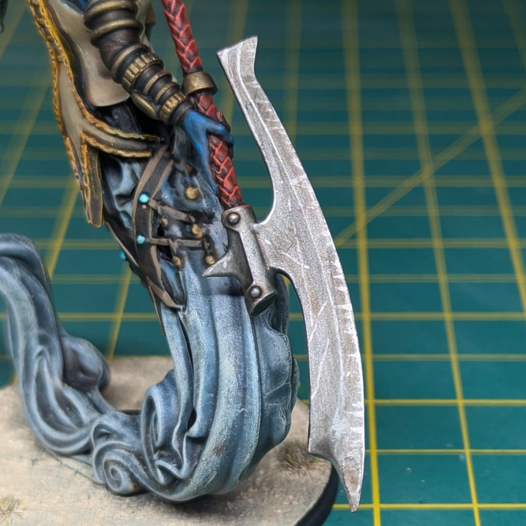 For the silver, it's a tale as old as time. Leadbelcher, Nuln Oil, a touch up with Leadbelcher, and some highlights with Stormhost Silver. A familiar, comforting recipe, like it's 2015 and you're just getting back into Warhammer. On the Steelheart glaives I dropped in a few scratches and dings along the edges.