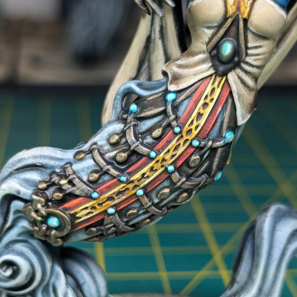 I love doing what I call "cheater's NMM" (non-metallic metals) on models with metallic cloth trim, like the tassels on a cloak or, in this case, a ton of trim everywhere. The goal here really is to give the impression of carefully constructed non-metallics, without actually really worrying about where the light is coming from, what areas are in shadow, and generally actually being competent. I imagine if there's one area of the models that people don't like, it might be this, but personally I do quite like it.