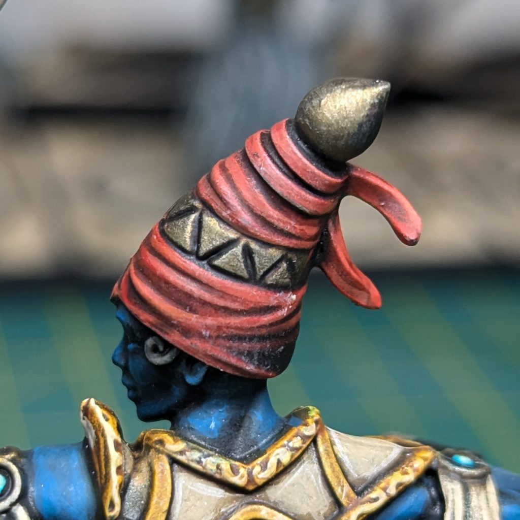 Recently I've been tackling the various brute units from the Sorcerer Kings, namely the Efreet Flamecasters, Windborn Djinn, and Steelheart Djinn, as well as a bonus Maharajah character. One of the potential joys of this faction is that you can really go all out on each unit, creating a carnival of colour that still looks coherent on the tabletop. I've got a lot of them to paint though, so I've opted for a more muted scheme that hopefully feels at home in the Sorcerer Kings' desert locales and still makes space for spot colours and details to draw the eye.There's a lot of crossover between units so I've split these sections up by material rather than model, apart from where something is specific to a unit like the Efreets' flaming protuberances. Before we jump in, here's a photo of a Maharajah as some visual reference for the kind of finish we're working towards.