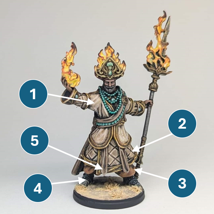 I was very keen on pale, sandy cloth colours like you might see being worn in the desert, so I knew it would be important to add some variation across the different areas to avoid models being too one-note. Here's a marked up photo of the Maharajah: