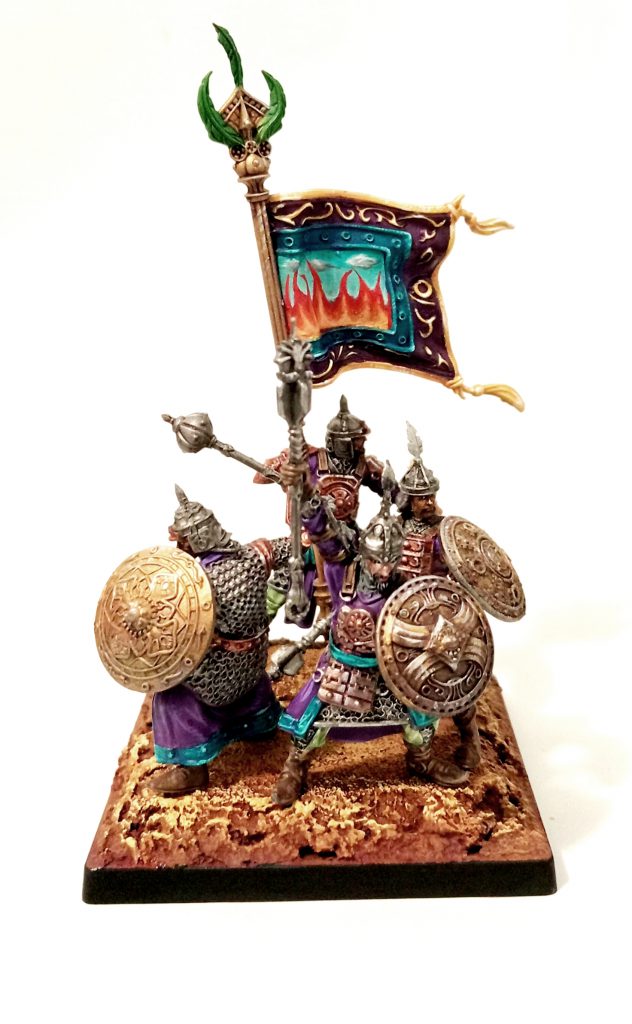Step 4: Dark wash the gunmetal metallics with whatever you want, Nuln Oil, Dark Wash, whatever works. Progress your cloth highlights with higher fractions of Blue Violet and Blue Green respectively. Same with the Cork Brown mix for the boots. Finish painting the face as you see fit. For the brass, use a detail brush to apply Mithril Silver, Army Painter's Shining Silver (or whatever bright silver you have) to theupper surfaces of the armour and specifically the shield. We're looking to build up a gradient from light to dark, top to bottom on the shields. Finally, using a watered down Ratling Grime, wash the bottom recesses of the shields to complete the gradient. After that, pick out any details, such as helment and baner feathers in whatever colour you want and manage the banner however you see fit. If you hate yourself, freehand something deep and meaningful, like I did. See the fire and clouds below? Yeah, Court of Fire and Court of Air. So clever.
