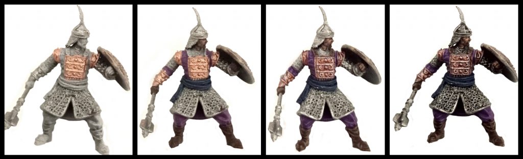 Step 3: We highlight the clothes, blending Blue Violet (70.811) into the Royal Purple and Blue Green (70.808) into the Dark Prussian Blue at about 50-50 mixes. Boots are highlighted with a 50-50 mix of Charred Brown and Cork Brown (70.843). Wash the brass with a purple wash (Army Painter Purple wash is...fine...I find it doesn't distribute pigment evenly, so if you have something you prefer, use that). The skin is given a high percentage coverage layer (75% or so) of 50-50 Charred Brown and Tanned Flesh.