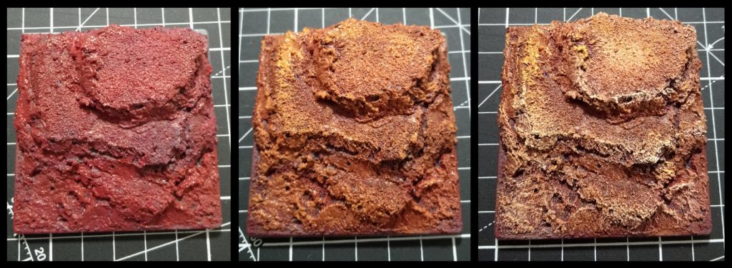 Step 2: Here I adjusted my mix to have more orange-brown in it, something like Jokaero Orange or Vallejo's Bronze Brown. You don't want 100% coverage but maybe 80-90%. After this, you'd refine the mix to have more of your orange-brown in it and start overbrushing it across the more textured areas/edges.