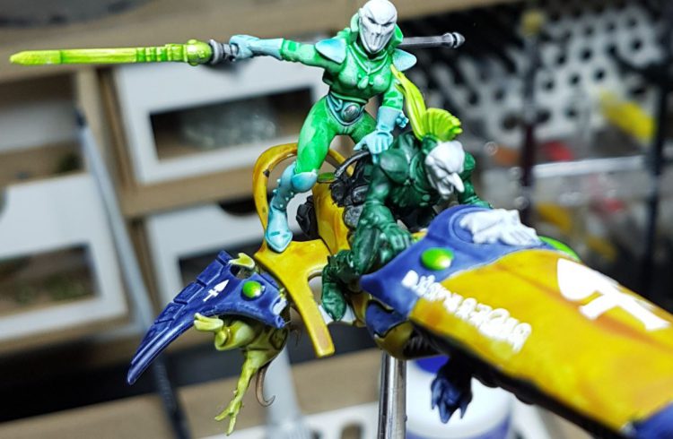 Last year to celebrate him turning very old, a friend and I decided his Murder Clown collection needed some zippy reinforcments via the Harlequin Skyweaver and we tried to match them with the Iyanden style theme he uses throughout his collection because he is a monster that likes painting yellow even back in the days when Bad Moon Yellow was a hateful chore to use.Luckily these days I have Constrast Iyanden to which I have waxed lyrical about many times... and I will admit the newer yellow paints these days are so much better too.