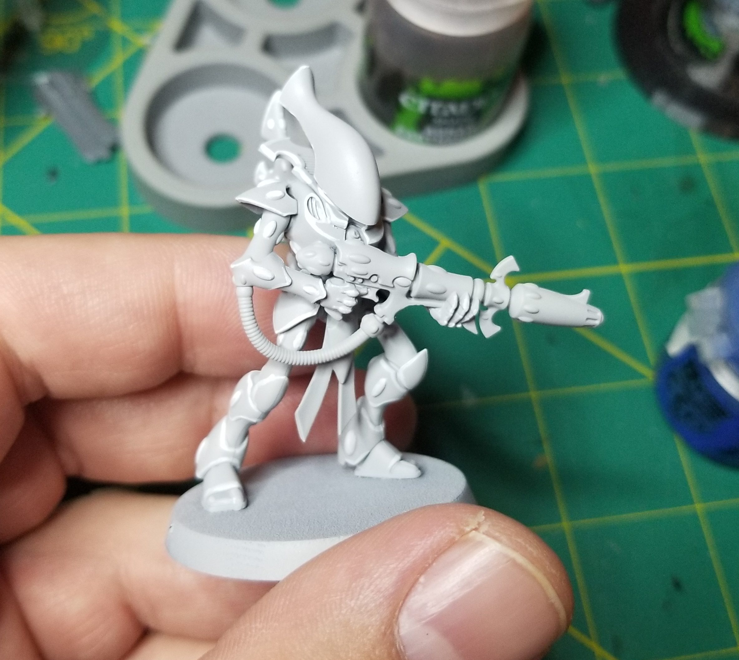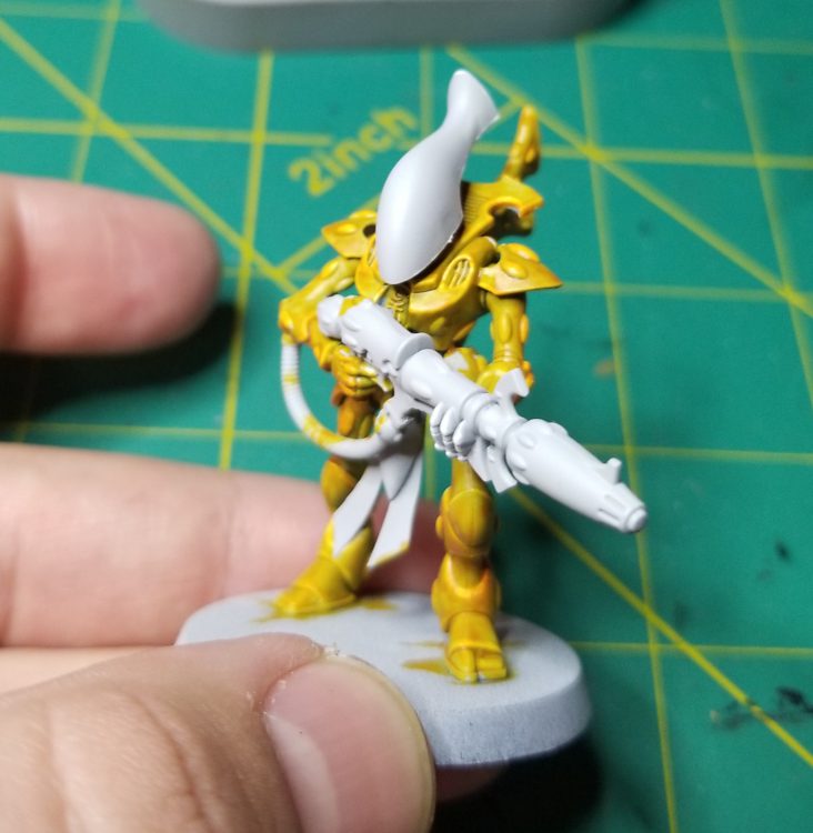 I'm pretty crazy when it comes to priming things black but I'm not stupid, so I started by priming my Wraithguard model with a coat of Grey Seer. Originally I was curious to see how Contrast Iyanden Yellow would work out on this model, so I decided to do some pre-wash highlighting, hitting it with edge highlights of Reaper Pure White to potentially create a faster process with a highlighted undercoat.