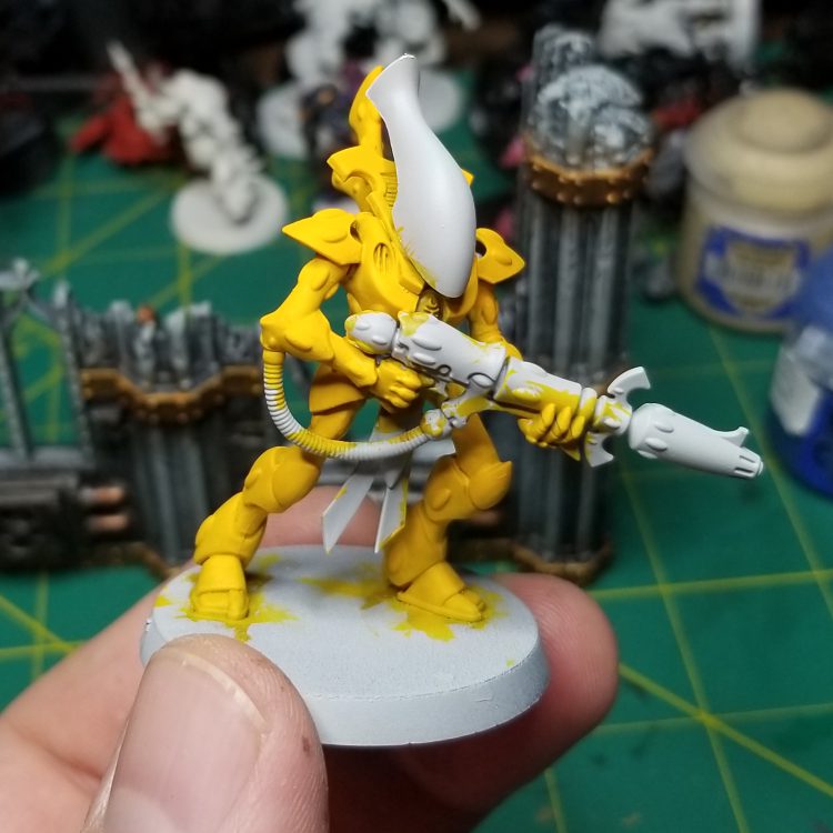 If you're working with a lot of yellow, it's potentially worth it to skip the brush and basecoat your minis with an airbrush. If you're looking for more methods of tackling the yellow armor of Craftworld Iyanden, check out our How to Paint Imperial Fists article, which covers several other methods for painting yellow armor, both with brush and airbrush.