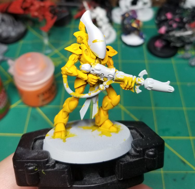 I really wasn't happy with the first coat of Iyanden Yellow. It was a bit too green, possibly because I used Grey Seer instead of Wraithbone, and it was blotchy in ways that definitely weren't working for me. The highlights on the undercoat definitely showed through though, so if you're going this route, consider doing likewise. If you're interested in the quick version that's all contrast, check out Beanith's tutorial below for an example of what that looks like with less effort. At this point I decided to just go ahead and basecoat the model with full yellow. The upside - and something I'd consider on future models - is that Iyanden yellow actually made for a fine first thin coat.